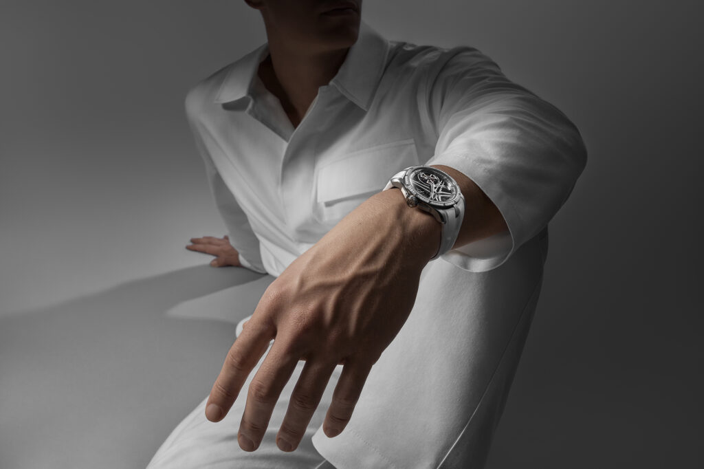 La couleur argentée naturelle du chrome cobalt est sublimée par une architecture squelettée d’un bleu intense, hommage à la teinte naturelle du cobalt pur. Ce bleu saisissant se retrouve sur l’étoile signature de la Maison ainsi que sur le bracelet en cuir de veau, équipé d’un système de libération rapide.