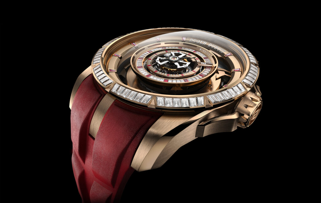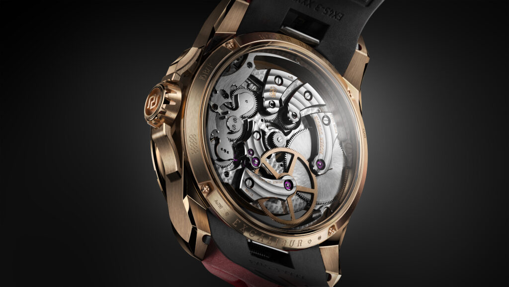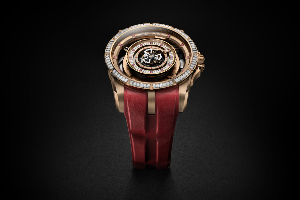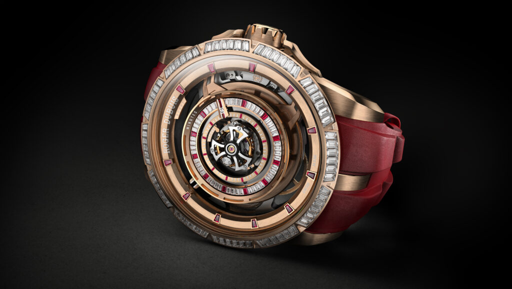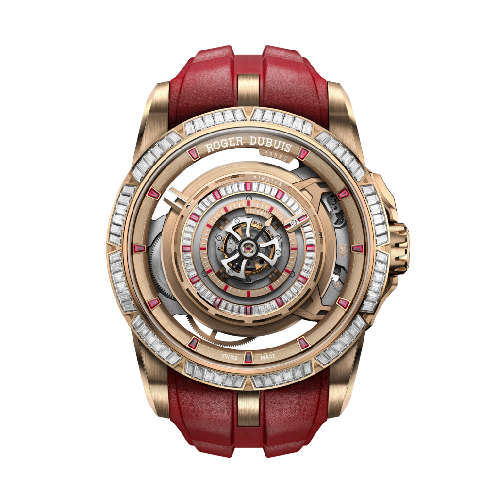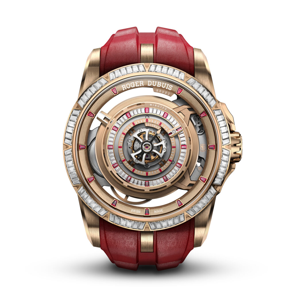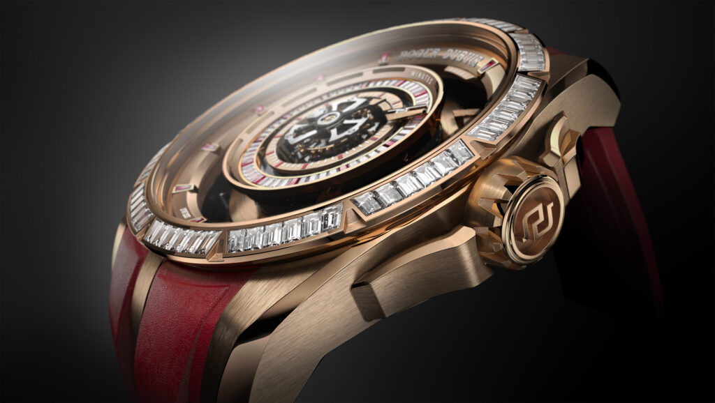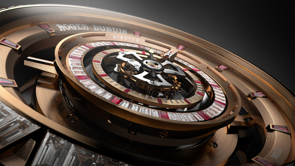 Ces innovations ne sont pas simplement techniques, elles sont au cœur de l’esthétique de la montre. La disposition concentrique des cercles d’or rose sur le cadran est un hommage à la précision et à la beauté mécanique, offrant une réinterprétation moderne du style squeletté signature de Roger Dubuis.