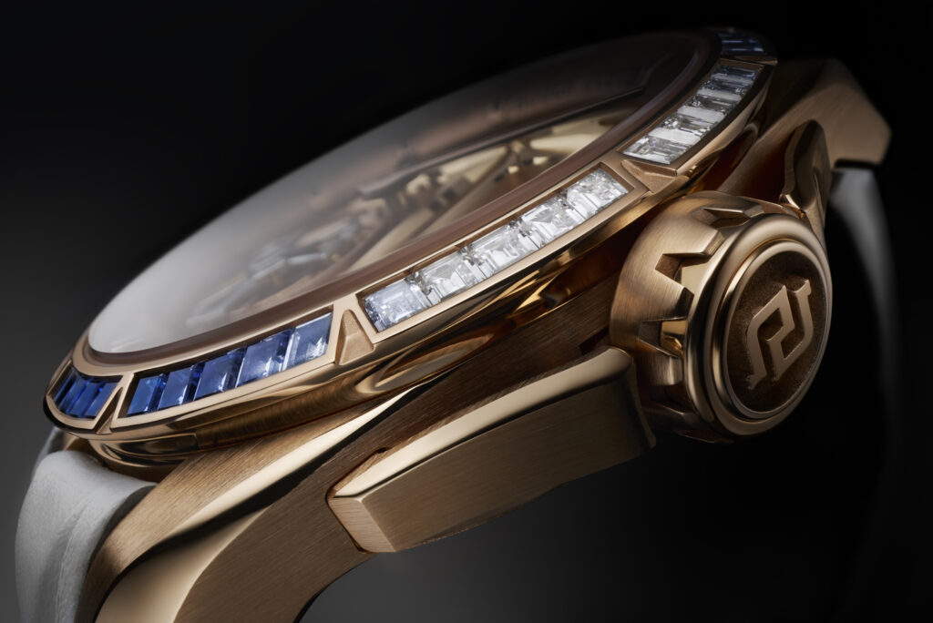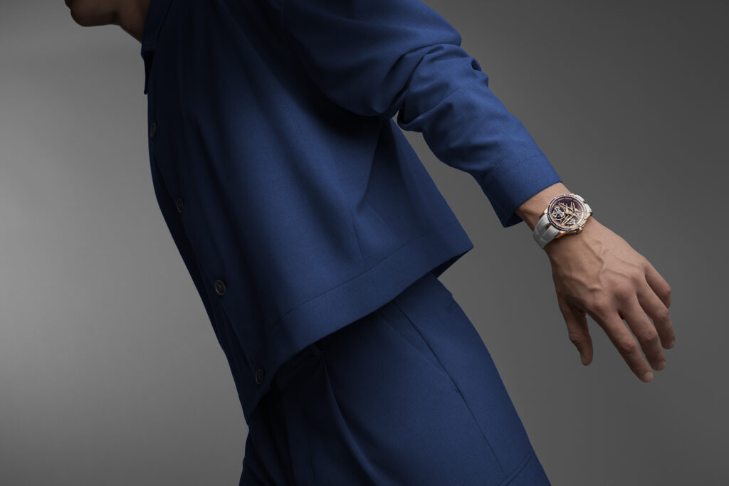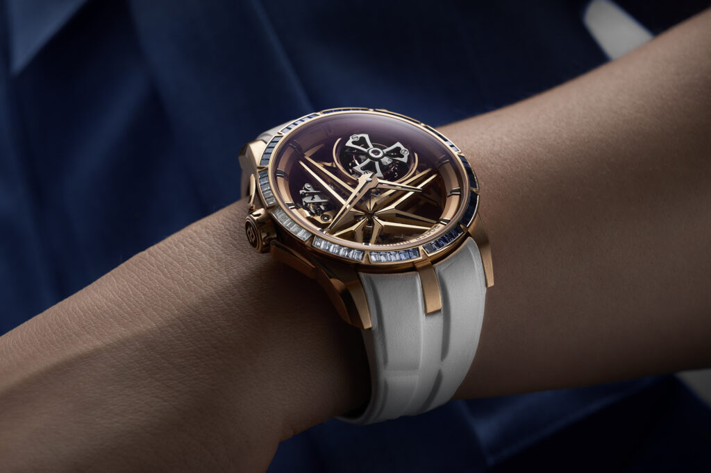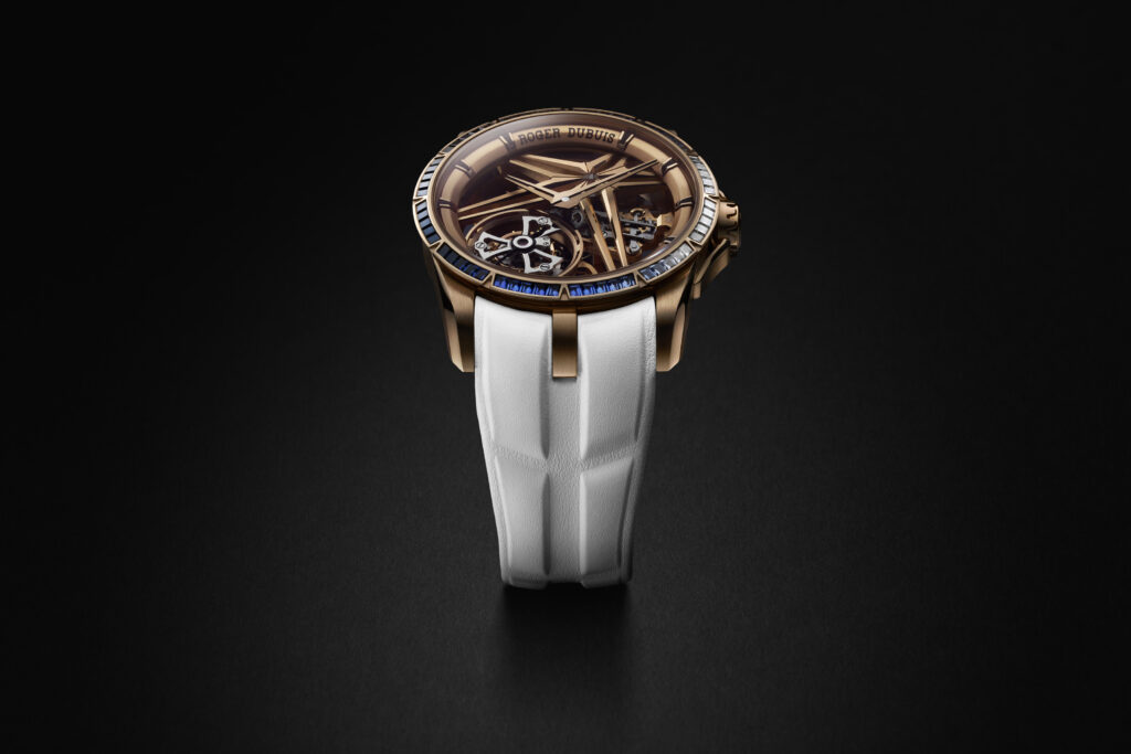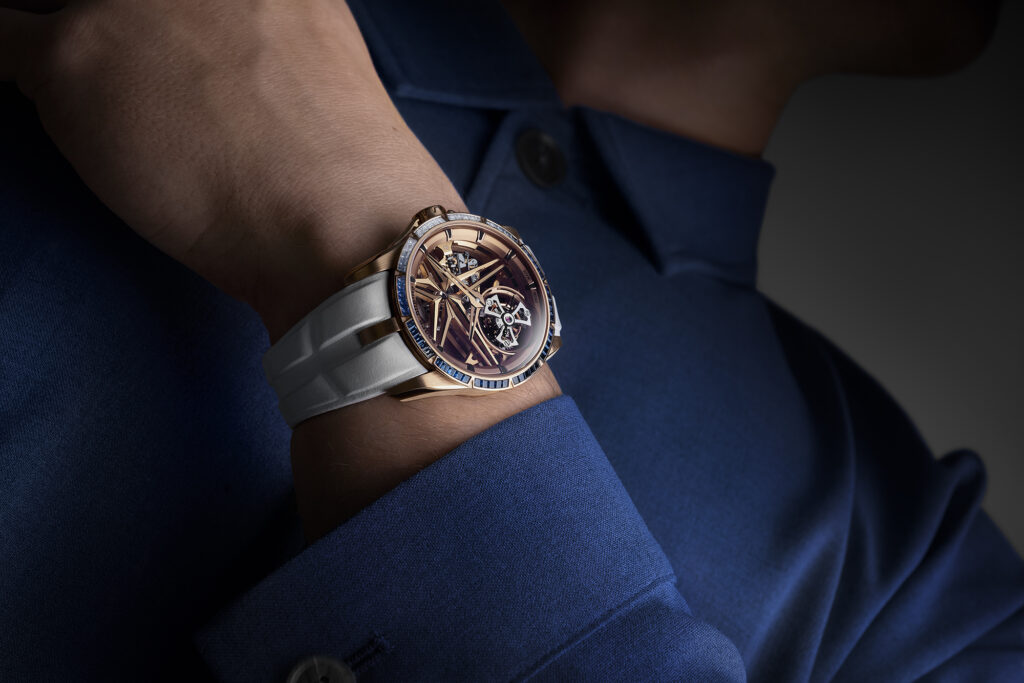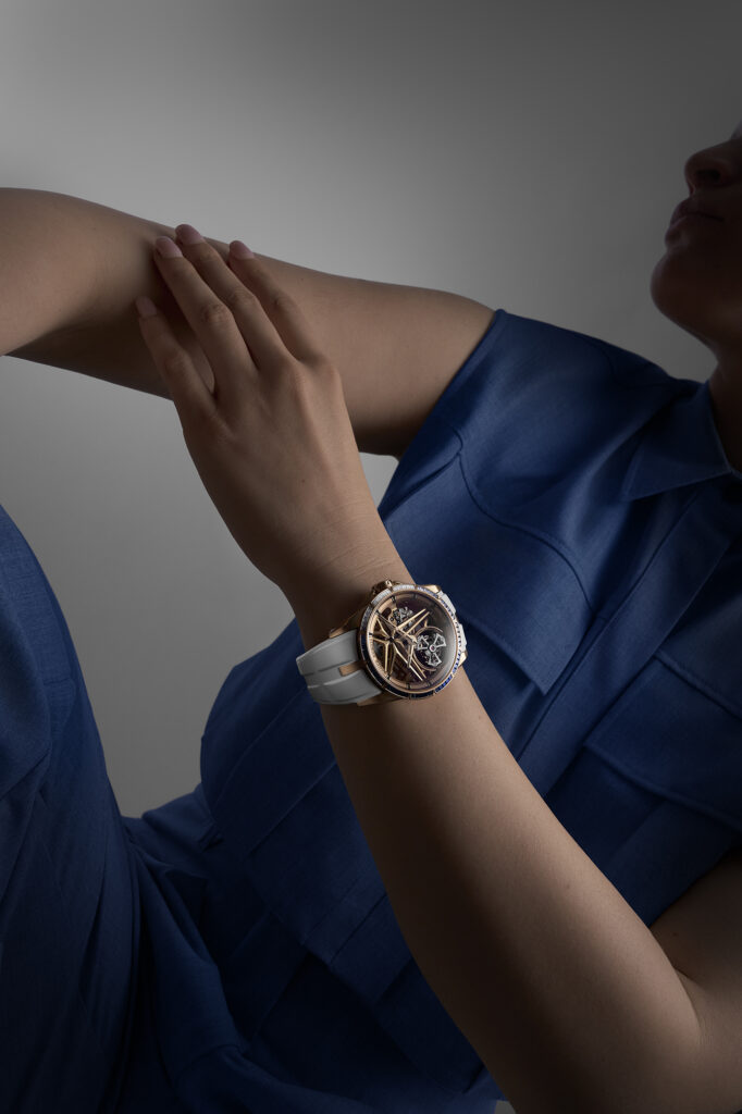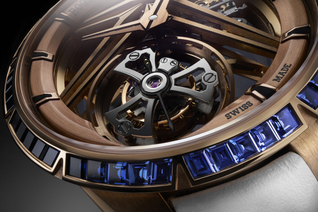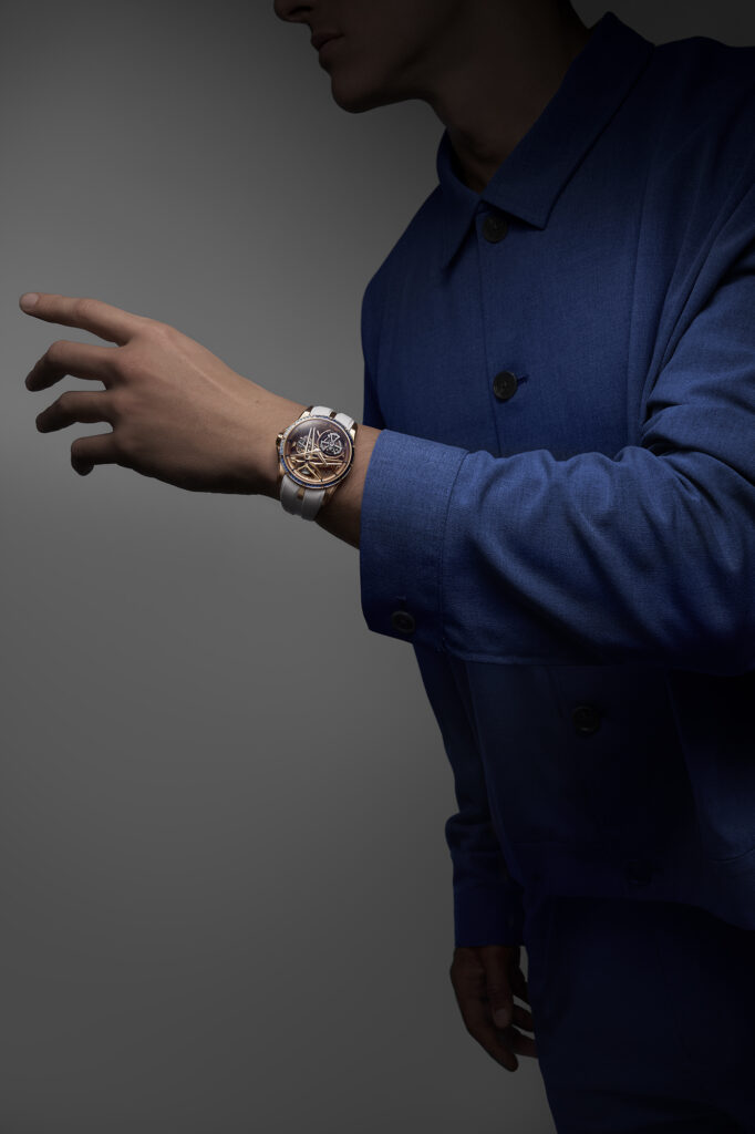 Le choix du squelettage n’est pas uniquement esthétique. Il permet à la lumière de jouer à travers le mouvement, renforçant l’impression de légèreté et de transparence. L’étoile signature de Roger Dubuis, en or rose, semble flotter dans ce cadre raffiné, symbolisant l’union parfaite entre tradition et modernité.