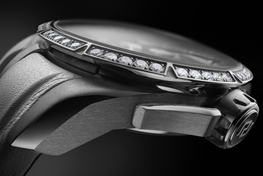 Cette édition limitée de l’Excalibur Monotourbillon est la première à être présentée dans un boîtier en or blanc 18 carats de 42 mm. Ce métal précieux, connu pour sa pureté et sa brillance, est sublimé par les lignes tranchantes et les encoches distinctives du design Excalibur. Chaque détail du boîtier est pensé pour mettre en valeur le mouvement interne, et le tout est magnifié par 60 diamants ronds disposés autour de la lunette, créant un effet visuel d’opulence discrète.
