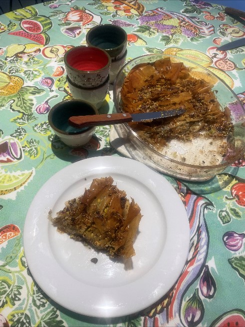 Et comment quitter Mykonos sans avoir suivi une leçon de cuisine privée avec la cheffe et blogueuse Angela Kalogeropoulos ? Nous nous installons donc dans la cuisine de sa jolie maison mykonienne dans une ruelle calme de Chora. En 3 heures, elle va nous faire découvrir quelques-unes des recettes emblématiques de la cuisine grecque, accompagnée d’un verre de Ouzo, boisson nationale grecque aux notes anisées (à consommer avec modération). Olives de Kalamata, Dolmas (feuilles de vigne farcies que l’on retrouve dans tous les pays de la Méditerranée), poulet Giousvetsi servi avec de l’Orzo, une alternative aux pâtes, le repas sous forme d’un mezzé remplit la table de mets tous plus appétissants. Nous préparons à 4 mains des petits pâtés à base de Phyllo, feta, tomates séchées et basilic, un Tzatzaki au concombre et fromage blanc et enfin un Saranagi avec des crevettes. Et pour couronner ce festin, Angela fabrique un Baklava, « la » pâtisserie qui doit clôturer les repas grecs.