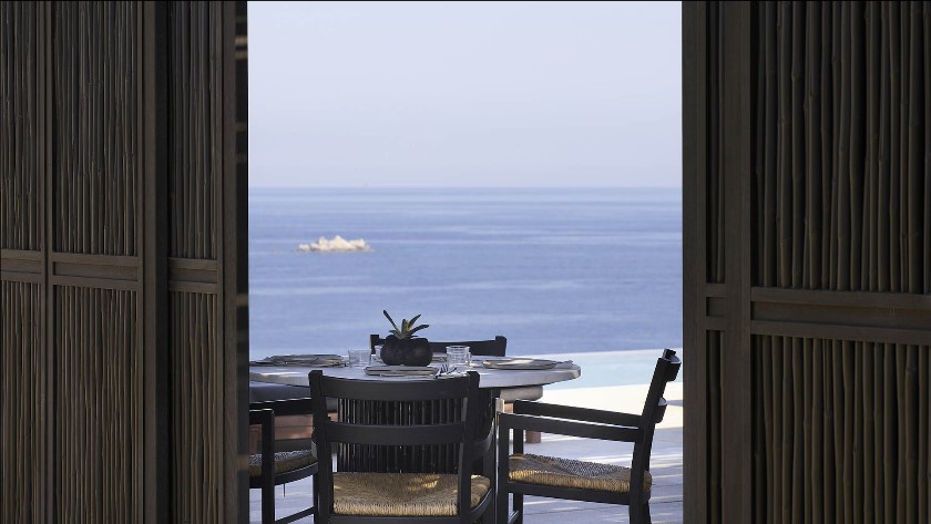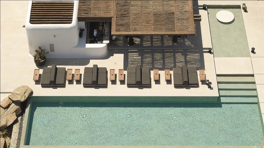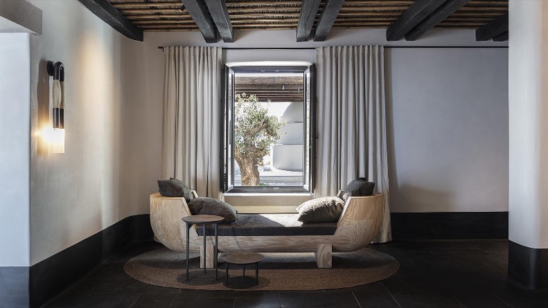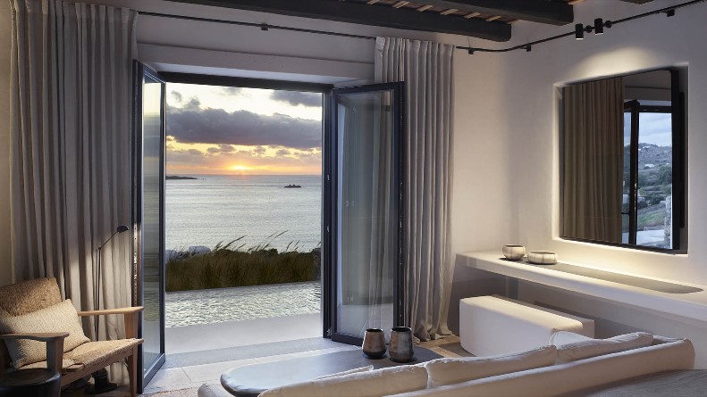 Le parti pris décoratif mélange matériaux d’origine locale – pierre, marbre et bois – et mobilier design épuré et minimaliste. Le luxe ici est avant tout le bleu du ciel et de la mer, ainsi que les parfums, dont celui des figues, une fragrance choisie par l’hôtel. Je tombe immédiatement sous le charme de la suite 501 composée d’une très grande chambre qui ouvre sur la piscine privée chauffée à 23 degrés, la baie d’Ornos et la Mer Egée. La salle de bains est constituée d’une grande douche à l’italienne intérieure et extérieure, mais la cerise sur le gâteau est la baignoire chaulée qui ouvre sur la terrasse. Cette dernière est équipée d’un beau salon en bois qui permet de se détendre et d’un coin cuisine pour prendre ses repas à sa guise.