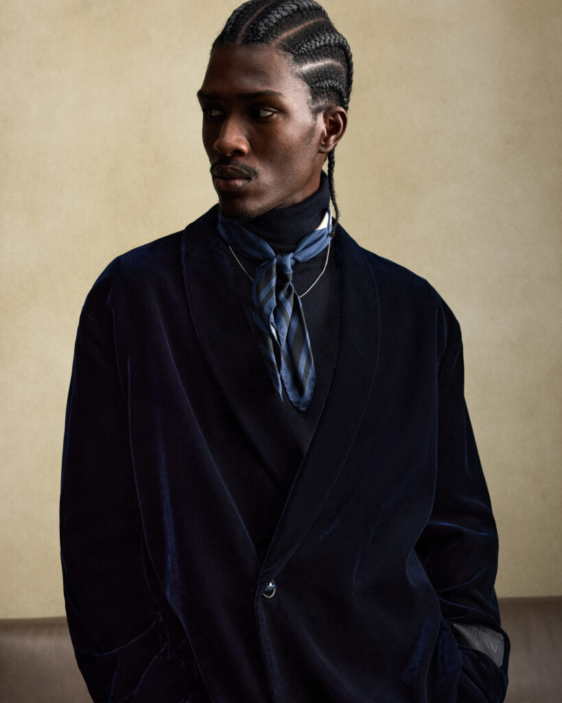 - L’Entertainer : Avec des teintes bleu marine et vert foncé, cette capsule se concentre sur des costumes en velours, des manteaux luxueux et des accessoires en soie, incarnant le charisme de ceux qui attirent tous les regards.