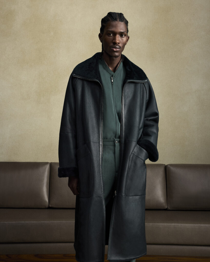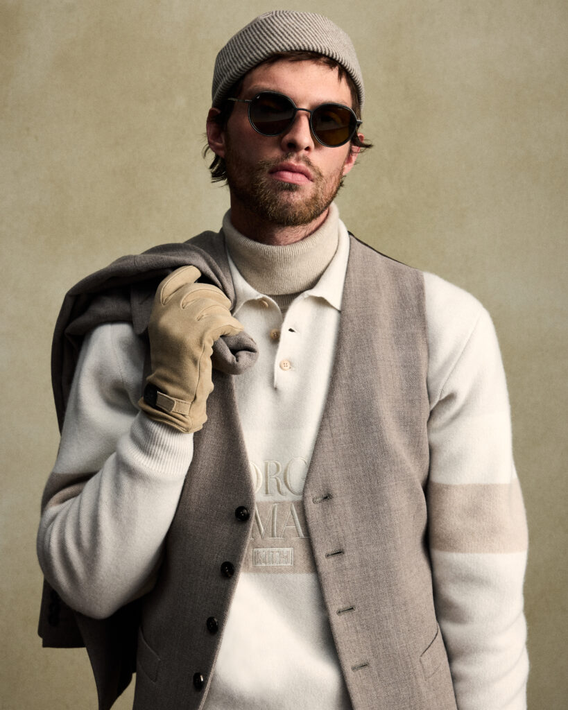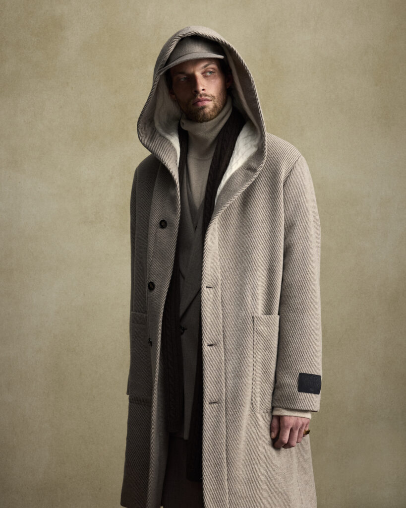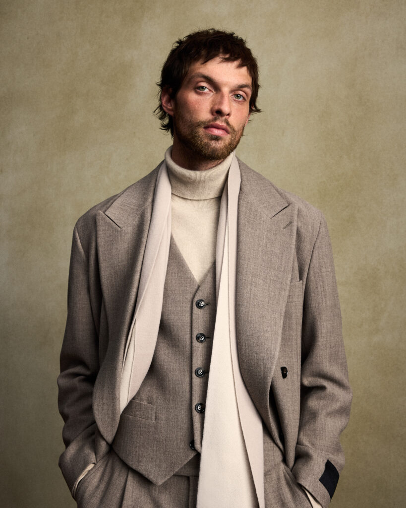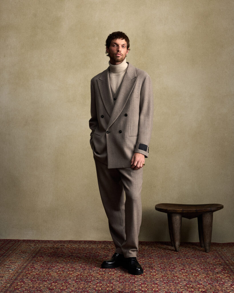 - Le Voyageur : Pour l’homme cosmopolite, cette capsule se décline en tons bronze et marron avec des costumes trois pièces en laine vierge légère, des manteaux oversize et des accessoires de voyage en daim.