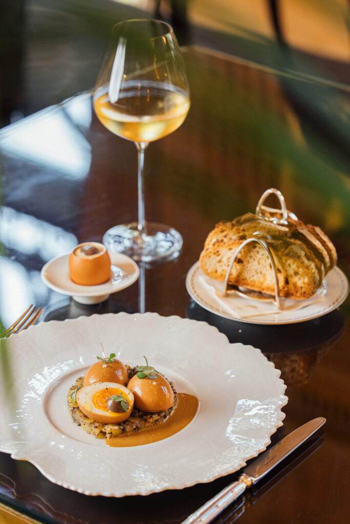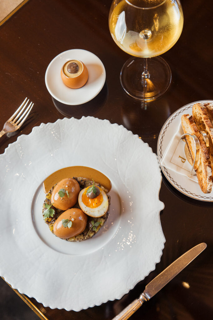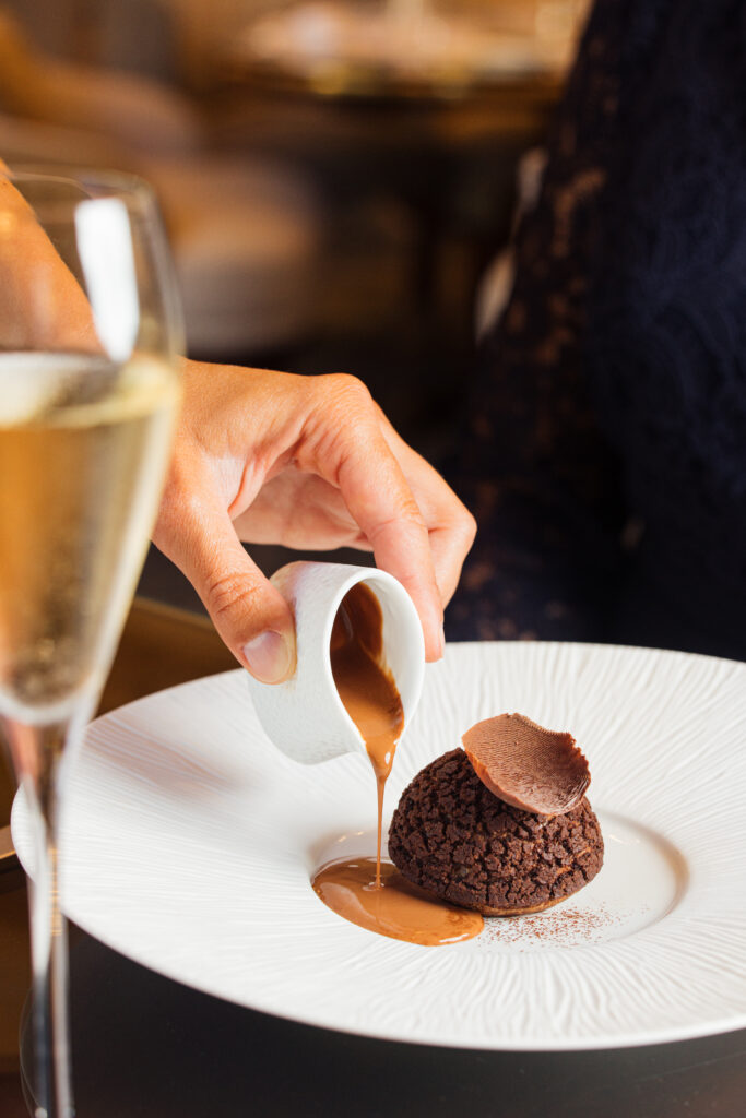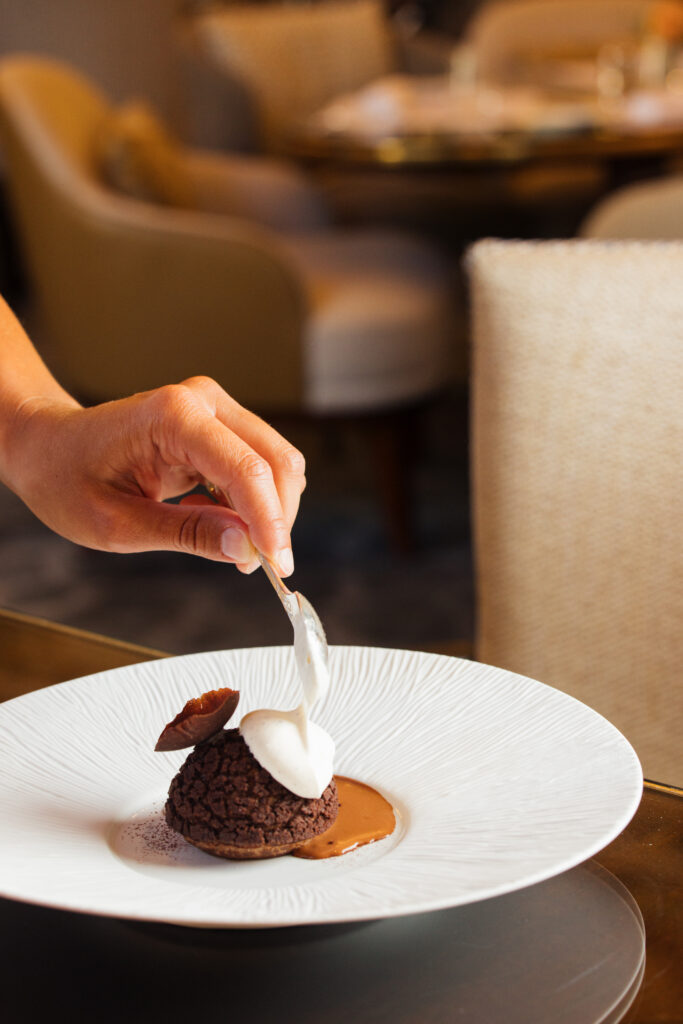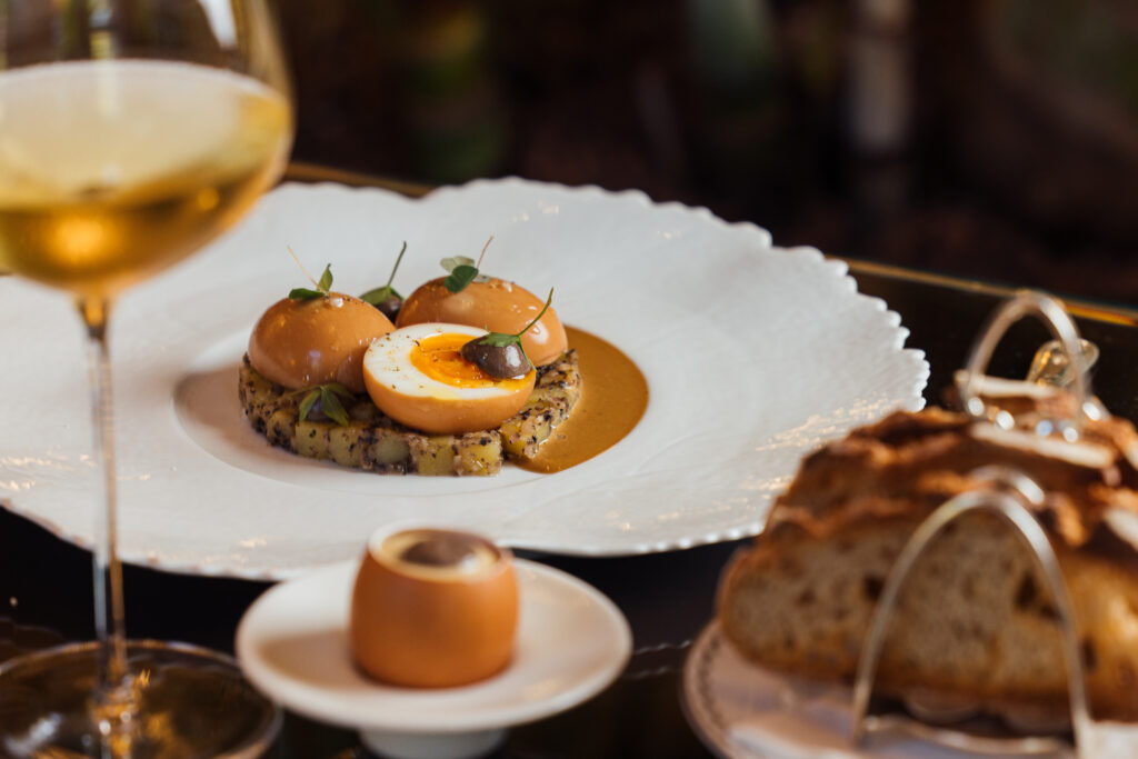 Le repas commence avec un œuf mayonnaise, accompagné d’une salade de pommes de terre à la truffe noire, suivi d’une quenelle soufflée à la flamme, agrémentée d’oseille et d’un jus de carapaces. Pour finir sur une note sucrée, le Chef propose une profiterole à la vanille de Bretagne, nappée d’une généreuse sauce chocolat, évoquant des souvenirs d’enfance.