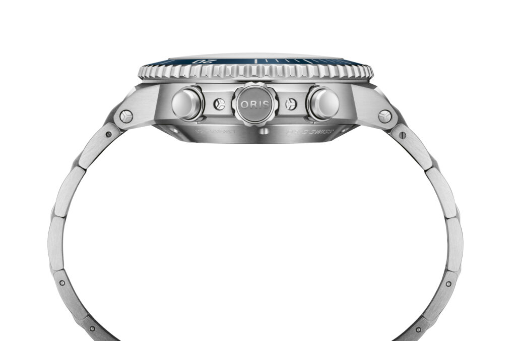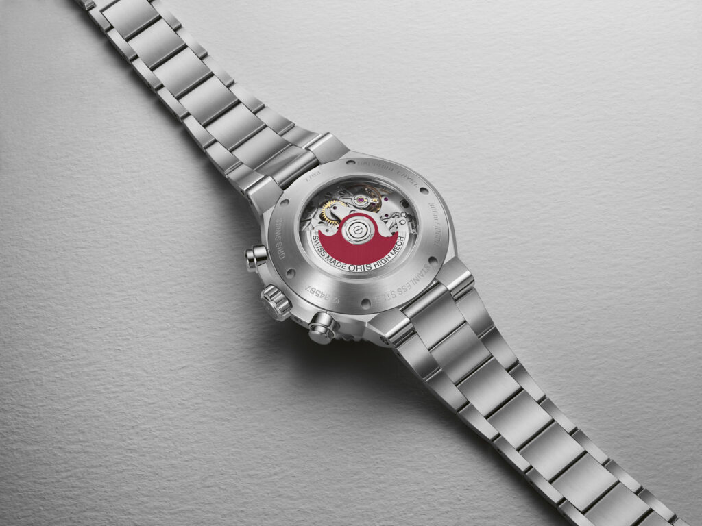 La montre est dotée du calibre Oris 771, un mouvement automatique suisse avec une réserve de marche de 62 heures et un dispositif stop-seconde pour une précision optimale. Elle est étanche jusqu’à 30 bars (300 mètres) et équipée de détails luminescents en Super-LumiNova®, d’une couronne vissée protégée et d’un fond transparent pour admirer le mouvement. Le bracelet en acier inoxydable avec boucle déployante brevetée assure un confort d’utilisation exceptionnel.