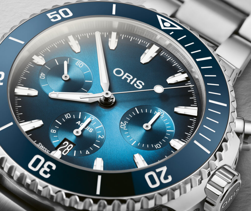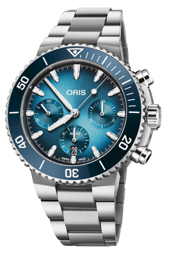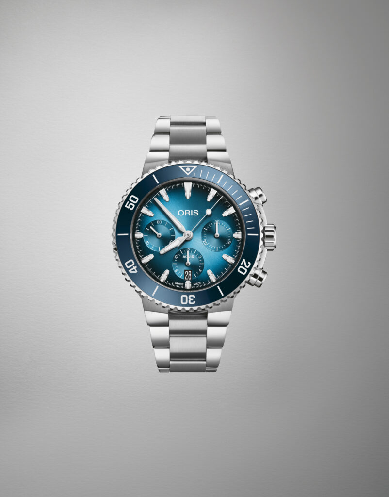 Oris présente la nouvelle Aquis Chronograph, une montre au design revisité qui allie élégance et performance. Avec ses sous-compteurs disposés en « smiley » à 3h, 6h et 9h, ce chronographe reflète la même attention aux détails que la collection Aquis Date, avec des améliorations notables en termes d’ergonomie et de lisibilité. Le boîtier en acier inoxydable de 43,5 mm et la lunette unidirectionnelle avec insert en céramique sont plus fins, tandis que le cadran bleu dégradé évoque les rayons du soleil pénétrant l’eau.