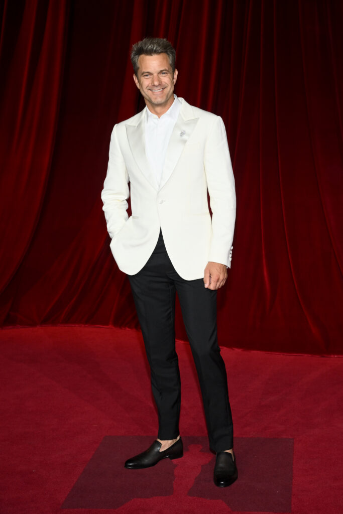 Joshua Jackson, quant à lui, a opté pour un style audacieux avec une veste de dîner en grain de poudre blanc et satin de soie, portée avec un pantalon tuxedo noir en mohair et satin. Complétant son look, il portait des mocassins Venezia en cuir Nero Grigio avec la signature scritto cursive, apportant une touche unique et luxueuse à sa tenue.