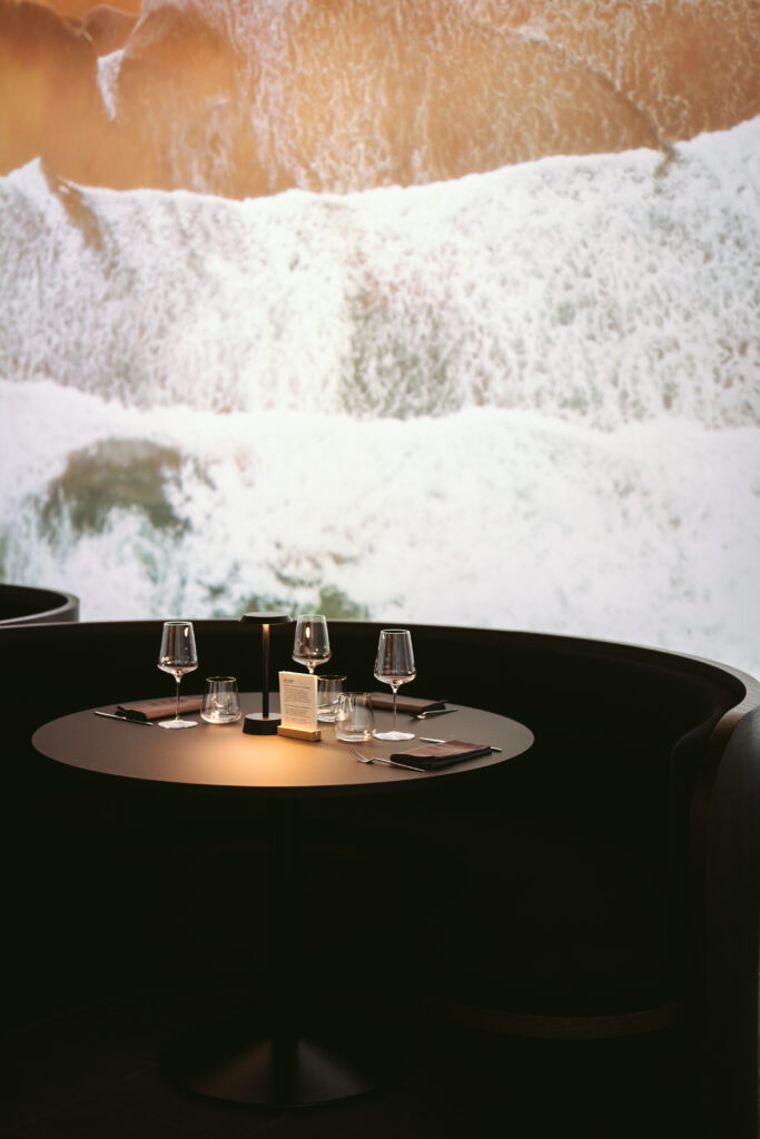 L’immersion visuelle et sonore orchestrée avec brio permet d’entrer en communion avec la nature et la culture basques. Le soin apporté aux textures, aux matériaux et à l’acoustique confère au lieu une atmosphère enveloppante. Que ce soit dans les détails des projections ou dans les choix architecturaux, tout concourt à enrichir l’expérience : des murs gris aux bandes LED rétroéclairées, chaque élément du décor s’accorde avec le thème immersif de la soirée. La salle de projection, surnommée le « Beurrier », en raison de sa forme arrondie, offre un cadre intime et immersif où chaque convive est comme suspendu entre réalité et rêve.