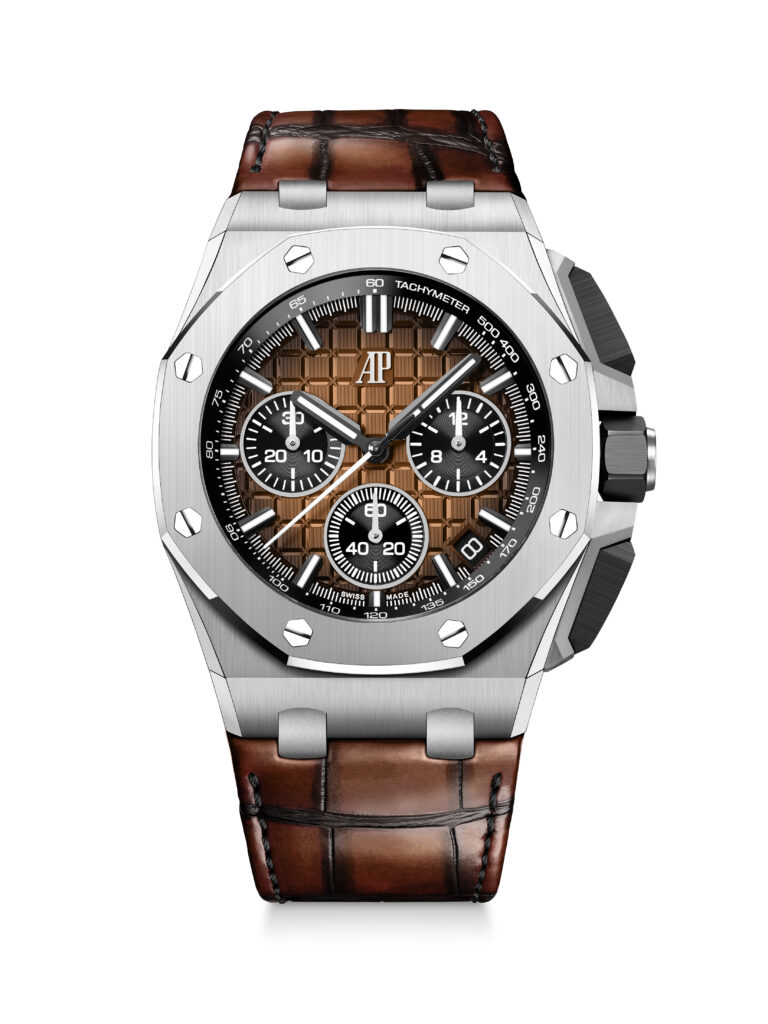Enfin, le Royal Oak Offshore Chronographe Automatique en acier de 43 mm fait son entrée avec un cadran bronze fumé inédit, inspiré par les habanos. Les compteurs noirs du chronographe, assortis aux poussoirs et à la couronne en céramique noire, renforcent la lisibilité et le contraste. Porté sur un bracelet en alligator marron avec une finition patinée à la main, ce modèle incarne à la fois élégance et performance, tout en offrant un bracelet supplémentaire en caoutchouc noir pour un style plus sportif.
