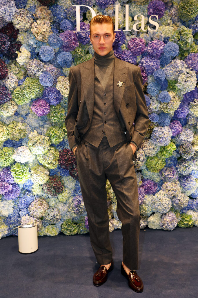 Lors de l’inauguration de la boutique Tiffany & Co. à Dallas en octobre 2024, le mannequin américain Lucky Blue Smith a captivé l’attention dans une tenue élégante de la maison Dunhill. Il portait le Look 5 de la collection Automne-Hiver 2024 de Dunhill, composée d’une veste Bourdon croisée en flanelle de laine et cachemire gris moyen, d’un gilet simple boutonnage assorti, d’un pull col roulé en cachemire ultra-fin et d’un pantalon double-pli également en laine et cachemire.
