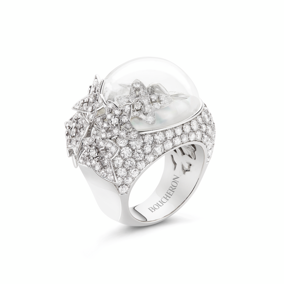 L’actrice arborait également la bague Lierre de Paris, une pièce fascinante qui allie cristaux de roche taille cabochon et pavage de diamants. Sertie sur or blanc, cette bague incarne la nature dans toute sa splendeur, à travers des lignes organiques et poétiques inspirées des feuillages du lierre, un motif cher à la maison de haute joaillerie.
