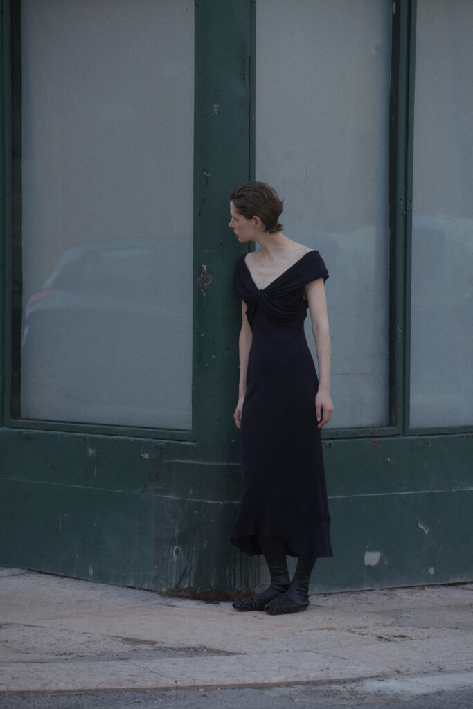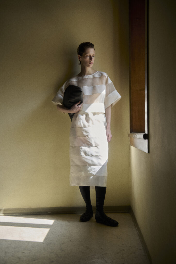 Les silhouettes de la collection atteignent majoritairement les chevilles, comme la robe de couleur verte herbe avec des plis verticaux qui s’écoule élégamment et met en valeur la silhouette. Les pantalons palazzo larges créent du confort, rappelant les éléments étendus de la collection, adoucis par des proportions volumineuses.
