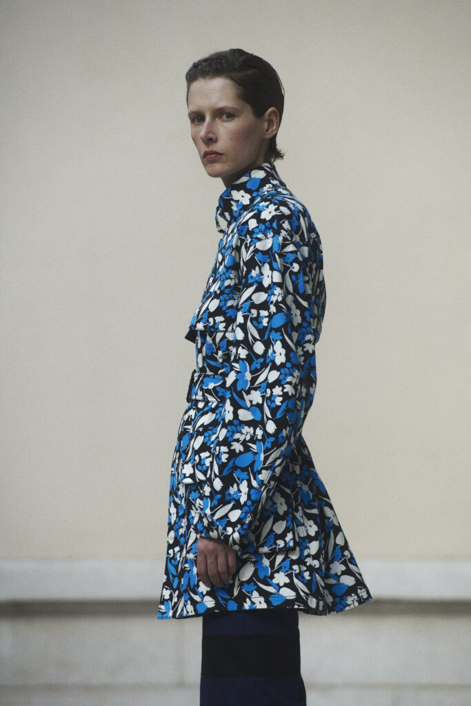 Les éléments clés de la collection comprennent des vêtements d’extérieur avec des silhouettes saisissantes et des couleurs vives, agrémentés de grands motifs floraux. Une robe-smocking sans manches à double boutonnage devient un incontournable de la garde-robe, pouvant être associée à un trench-coat ample. Ce trench-coat présente un design genré-neutre et peut être noué à la taille pour un look de jour ou porté librement pour un style de soirée décontracté, orné d’un détail en forme de nœud ou de col.