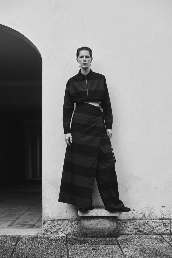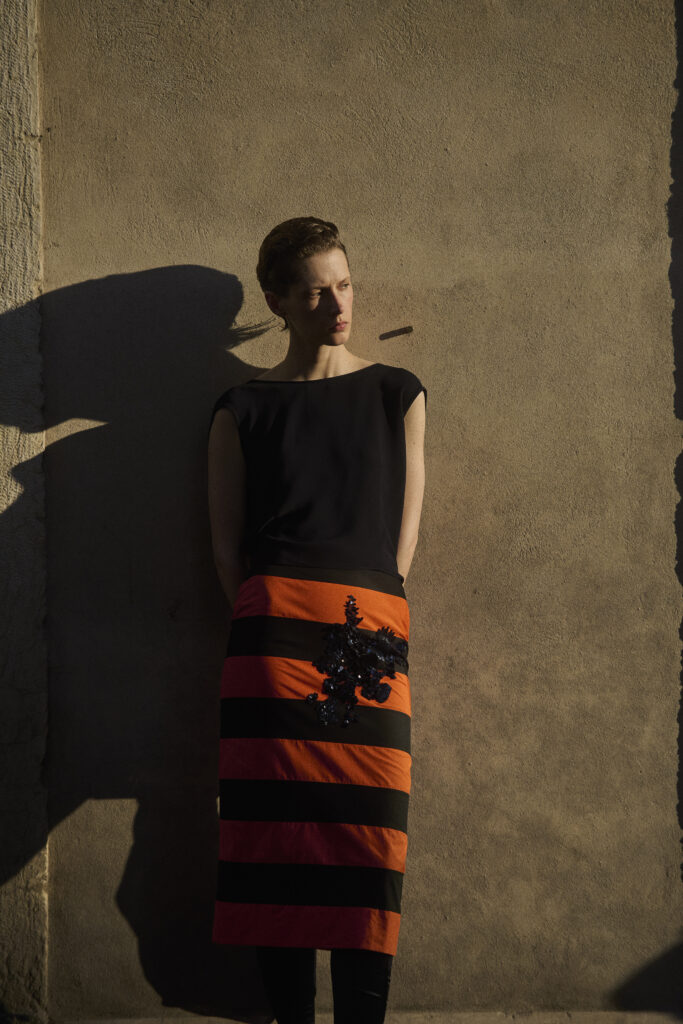 L’attention est attirée par une jupe de taille moyenne ornée de grandes rayures noires et orange, confectionnée en popeline de coton et rehaussée d’une broderie de sequins qui ajoute de l’éclat. La jupe peut être associée à un top bleu sans manches sous une veste croisée en viscose organza avec des épaules accentuées ou à une simple veste safari noire en mélange de lin et de coton.