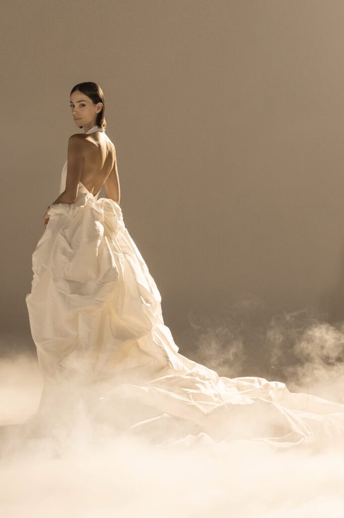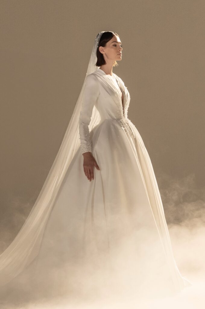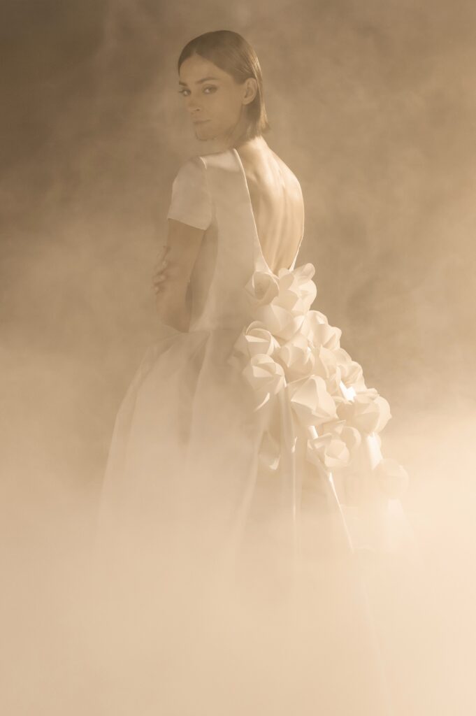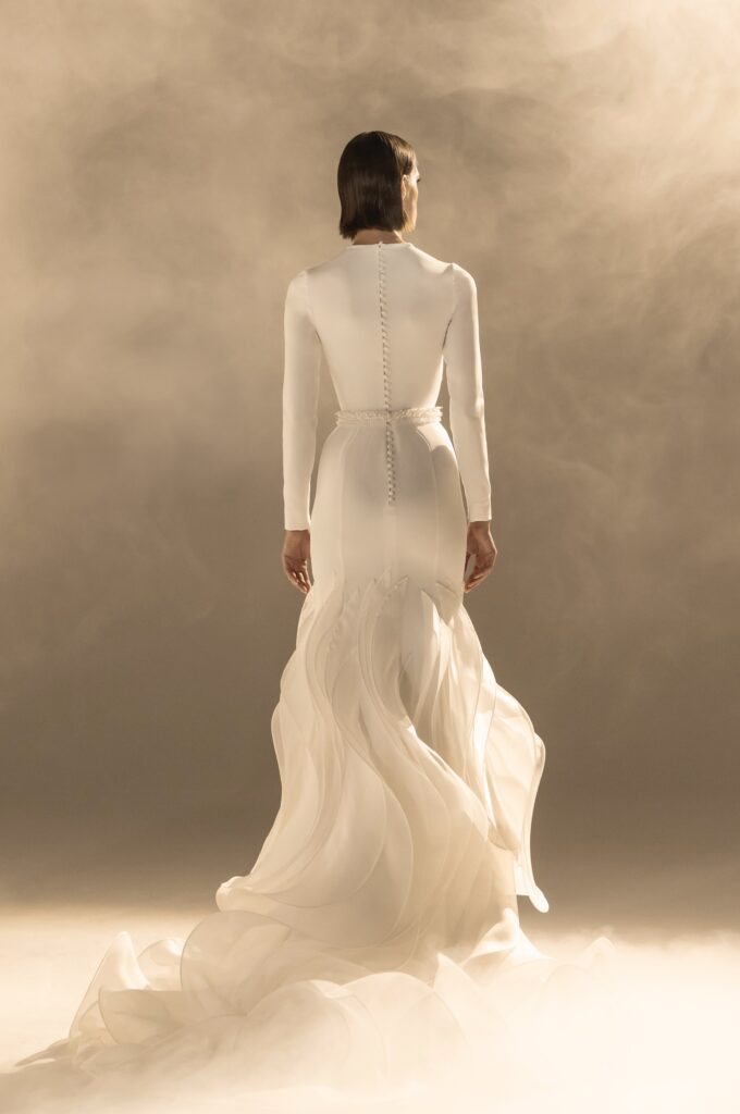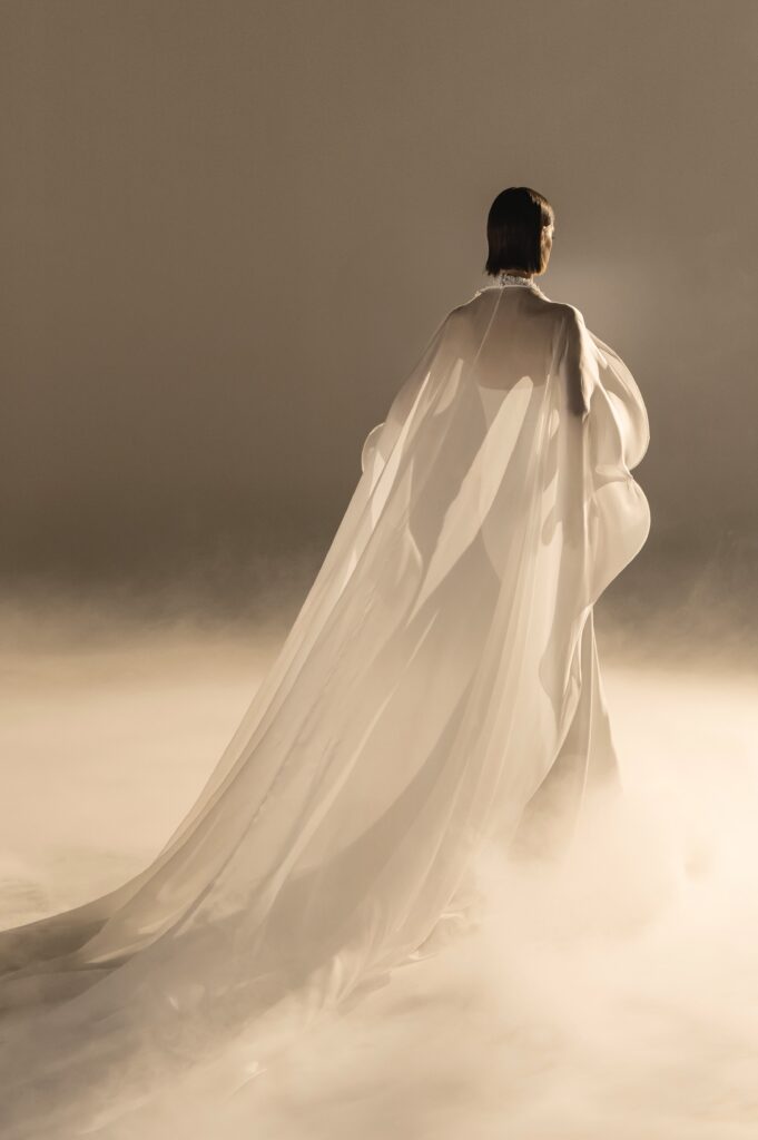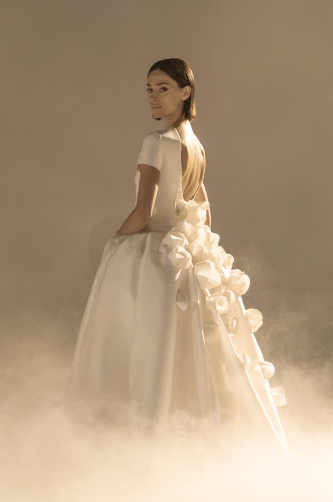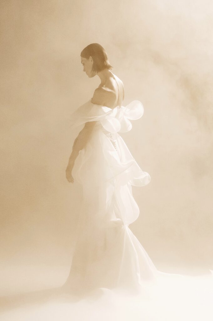 Pour sa quatrième collection dédiée à la mariée, Stéphane Rolland signe une ode à l’audace et au raffinement, proposant deux silhouettes distinctes qui incarnent l’essence de son art. D’un côté, une allure prononcée et glamour, sublimée par des traînes majestueuses en taffetas de soie bouillonnée ou des ruchés d’organza blanc, tels des nuages en mouvement, créant une silhouette théâtrale. L’autre silhouette s’impose dans une opulence magistrale, évoquant la grandeur des infantes avec des jupes larges drapées de mikado blanc, finement brodé de cristaux et de perles, ou encore ornées de dentelle immaculée.