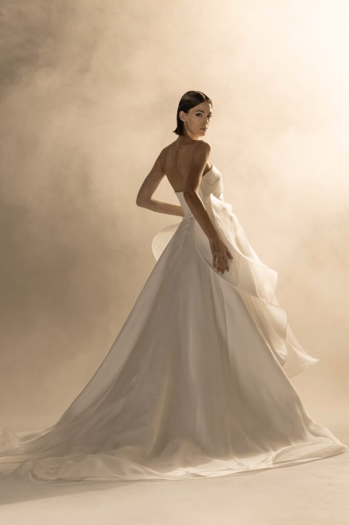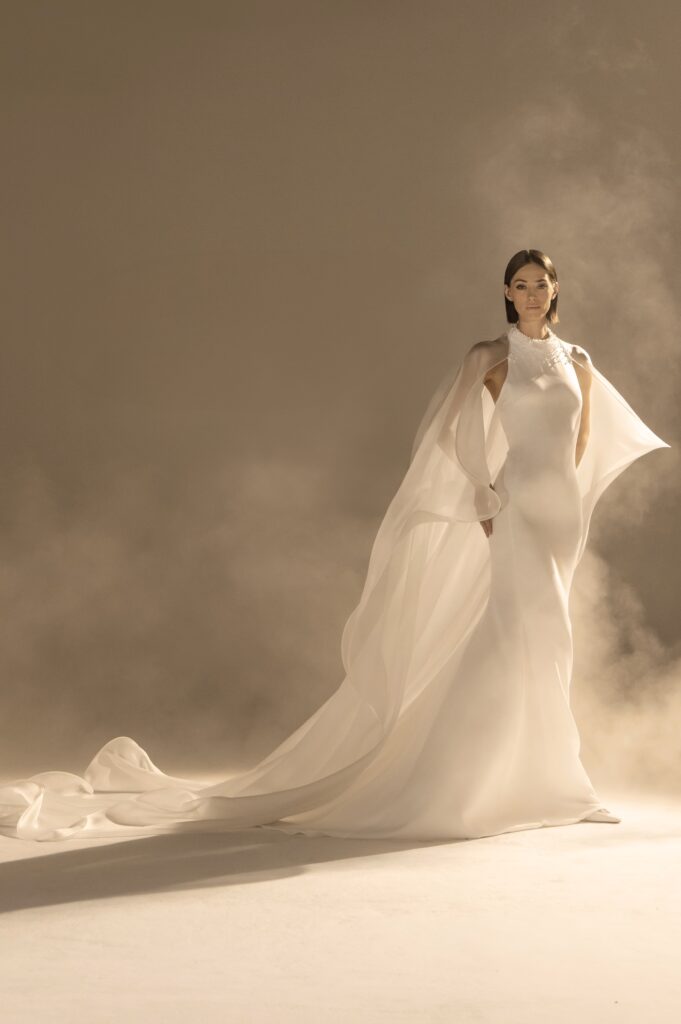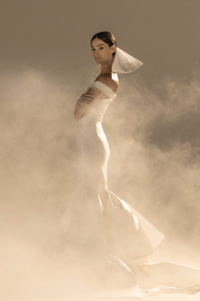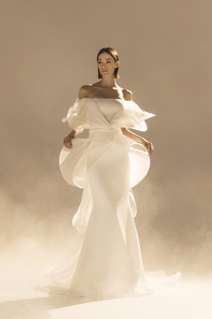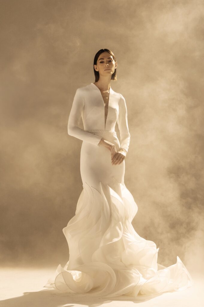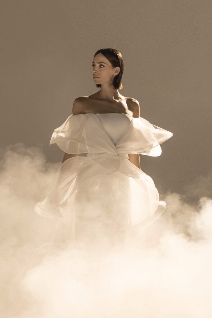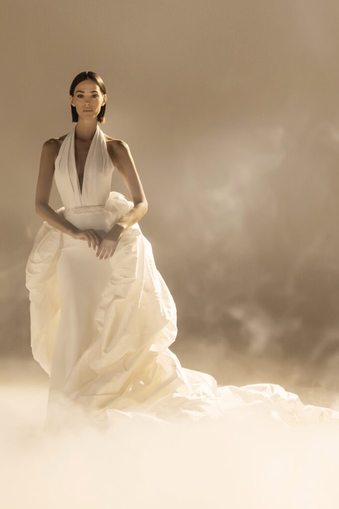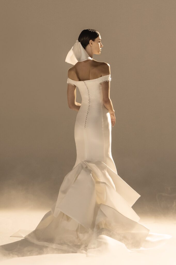 Pour sa quatrième collection dédiée à la mariée, Stéphane Rolland signe une ode à l’audace et au raffinement, proposant deux silhouettes distinctes qui incarnent l’essence de son art. D’un côté, une allure prononcée et glamour, sublimée par des traînes majestueuses en taffetas de soie bouillonnée ou des ruchés d’organza blanc, tels des nuages en mouvement, créant une silhouette théâtrale. L’autre silhouette s’impose dans une opulence magistrale, évoquant la grandeur des infantes avec des jupes larges drapées de mikado blanc, finement brodé de cristaux et de perles, ou encore ornées de dentelle immaculée.