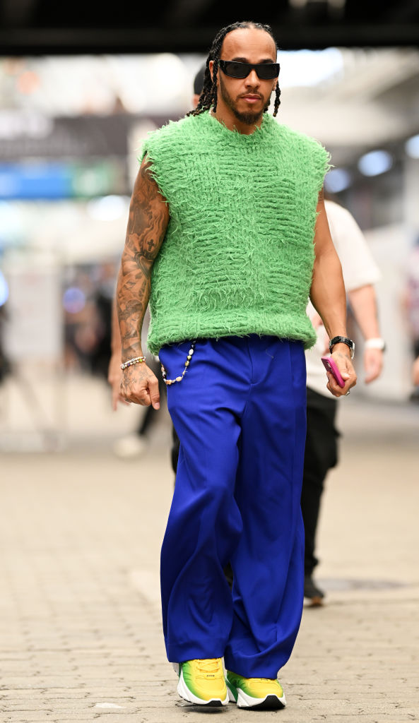 Sa tenue se composait d’un débardeur vert sans manches en maille, conçu sur mesure pour un style à la fois décontracté et raffiné. Hamilton l’a associé à un pantalon large en coton bleu, apportant une touche de modernité et de fluidité au look. Mais le point d’orgue de cette tenue réside dans ses sneakers B44 Blade jaunes et verts, également réalisés sur mesure. Ces chaussures incarnent parfaitement l’esprit de compétition et le dynamisme du pilote, tout en intégrant les couleurs vives du Brésil, un hommage subtil à l’événement.