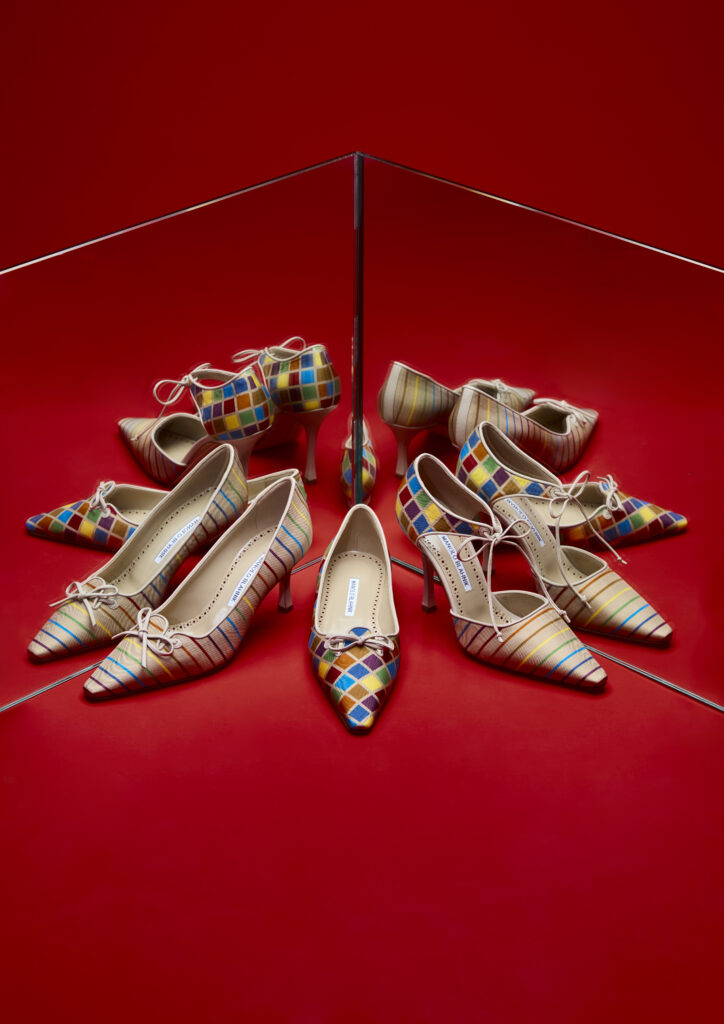 La collection Hiver 2024 met en avant la créativité débordante de Manolo Blahnik et son savoir-faire artisanal. Des techniques complexes et des matériaux soigneusement choisis donnent naissance à des modèles iconiques comme le patchwork multicolore sur les modèles Estho et Esmaa, et des créations graphiques et vibrantes sur les modèles Oyounak et Tamer. Ces pièces témoignent de l’inspiration continue que Manolo puise dans le travail des artistes novateurs.
