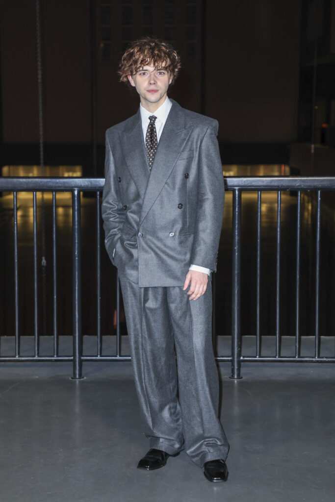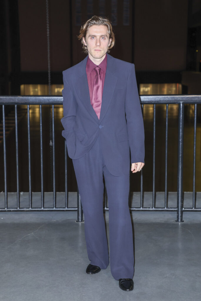 Jack Wolfe a opté pour un style rétro des années 90, revisité avec sophistication. Il portait une veste ajustée en cachemire avec un pantalon assorti, le tout complété par une chemise en popeline de coton et une écharpe en twill de soie, ajoutant une touche de modernité au look nostalgique. Les derbies Jean en cuir lisse renforçaient l’aspect classique, tout en rappelant l’esthétique emblématique de Saint Laurent.