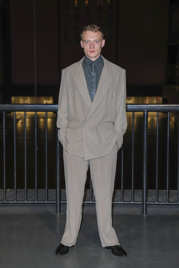 Jack Farthing incarnait l’élégance masculine dans une veste en crêpe de soie associée à une chemise en crêpe de soie. Ce look monochrome était rehaussé par une cravate large en soie tissée, ajoutant un contraste texturé. Le tout était assorti de pantalons en crêpe de soie et des derbies Adrien en cuir glacé, qui conféraient à l’ensemble une allure à la fois intemporelle et raffinée.