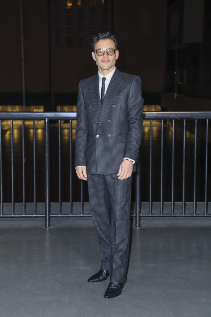 Rami Malek, fidèle à son style audacieux, a choisi une veste en gabardine de laine rayée assortie à un pantalon des années 90 en gabardine rayée. La chemise en faille et la cravate rayée en faille ajoutaient une touche sophistiquée, tandis que les bottes Vassili en cuir lisse apportaient une note contemporaine et rock, caractéristique des créations d’Anthony Vaccarello.