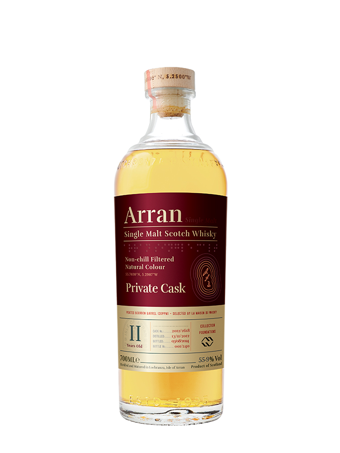 - Arran 11 ans 2012 Peated Bourbon Barrel – Avec un taux de phénols de 20 ppm, cette édition limitée à 240 bouteilles incarne la richesse fruitée et tourbée des whiskies de l’île d’Arran. Un whisky puissant, à la fois médicinal et maritime, parfait pour les amateurs de tourbe.