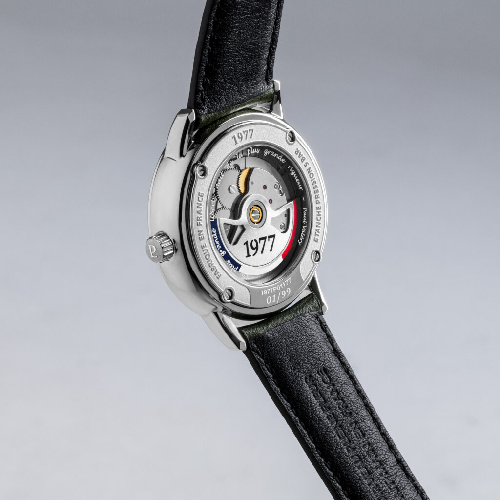Les montres 1977 se distinguent par un niveau de finition premium, avec des composants sélectionnés pour leur excellence. Les modèles sont animés par des mouvements à ancre mécanique, conçus en partenariat avec France Ébauches, l’une des dernières manufactures françaises de mouvements horlogers. Ces mouvements offrent une réserve de marche de 44 heures et se distinguent par leur décoration unique, notamment une masse oscillante ornée de détails tricolores.