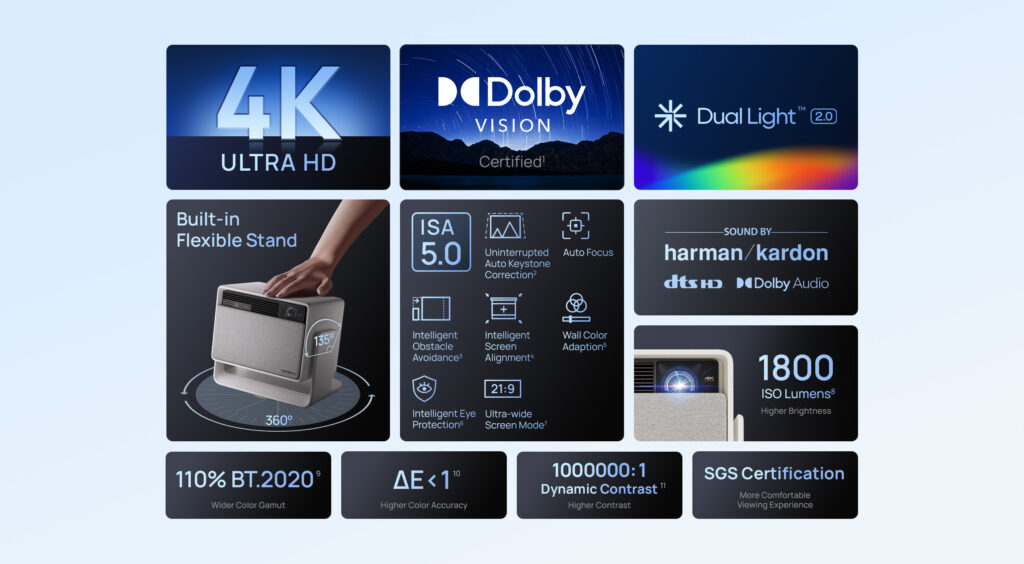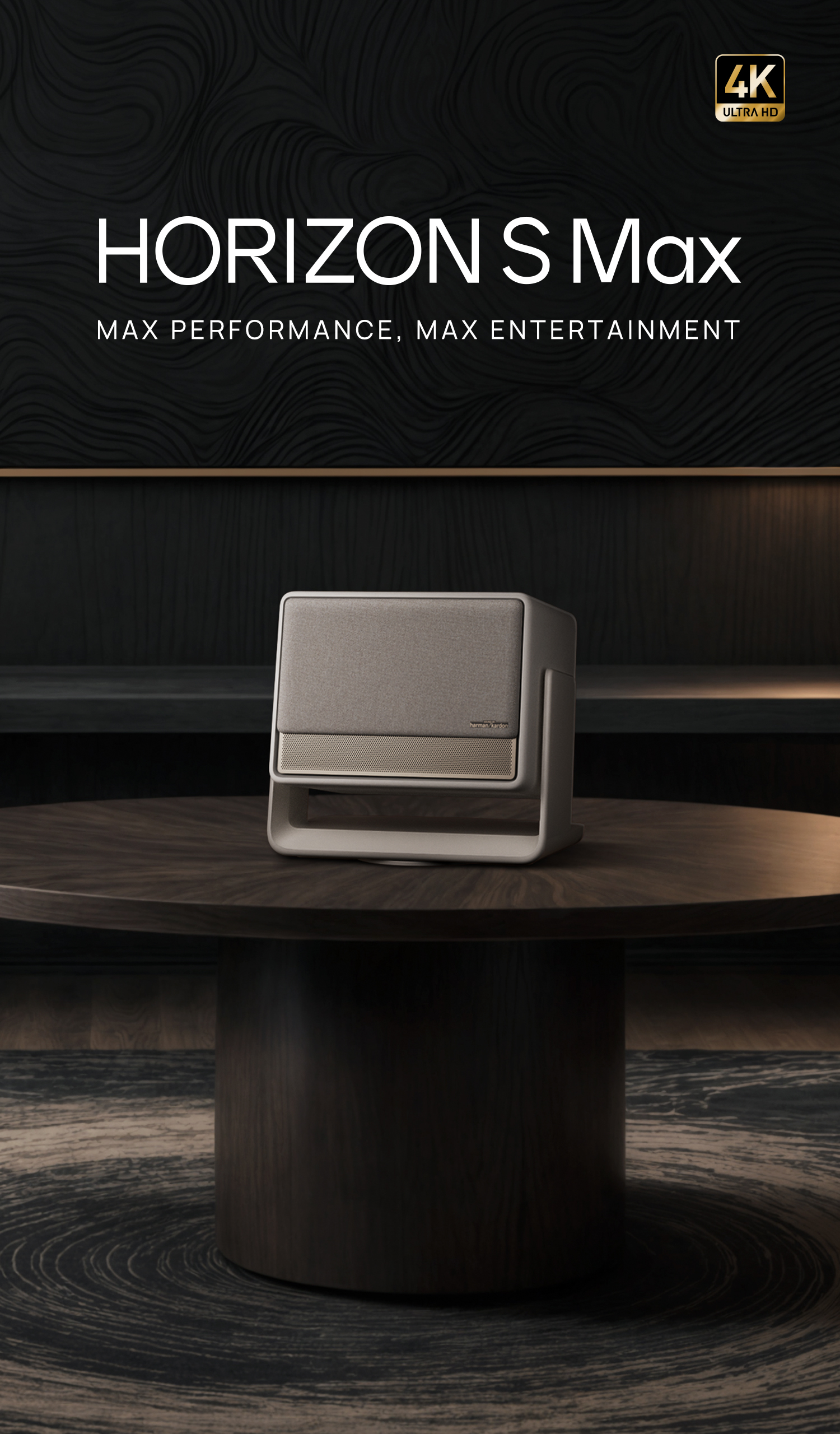 Le HORIZON S Pro est une option idéale pour ceux recherchant un vidéoprojecteur performant avec Dolby Vision mais sans la certification IMAX. Avec une luminosité de 1800 lumens ISO, il offre des images 4K éclatantes, et comme le HORIZON S Max, il dispose d’un son signé Harman Kardon et de l’audio Dolby pour une expérience sonore immersive.