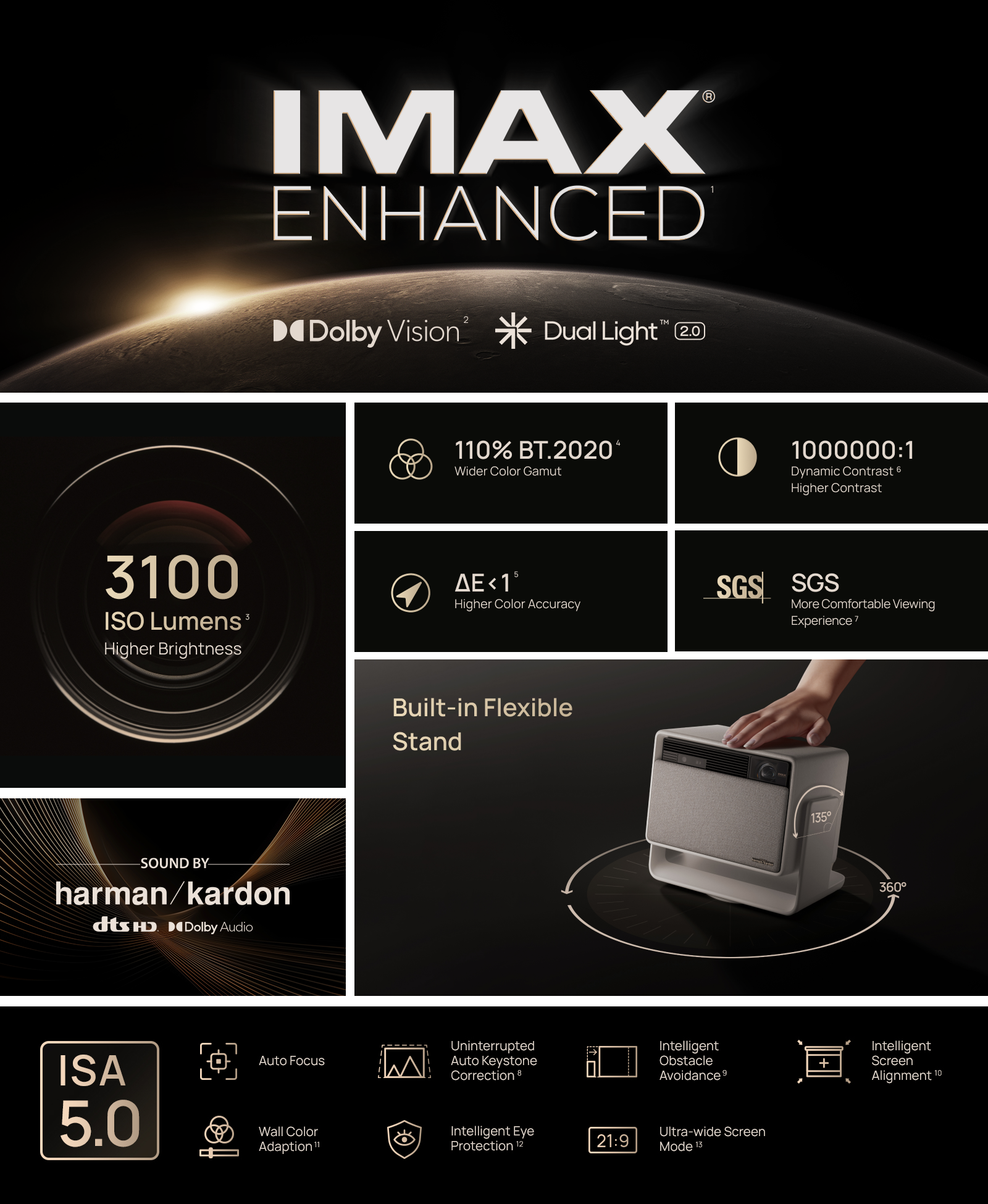 Conçu pour offrir une immersion cinématographique maximale, le HORIZON S Max est certifié IMAX Enhanced et Dolby Vision, garantissant des images ultra-réalistes. Avec ses 3100 lumens ISO, ce modèle assure une luminosité idéale pour une utilisation dans divers environnements. Le son signé Harman Kardon (haut-parleurs de 12 W) enrichit l’expérience avec des technologies comme DTS Virtual et Dolby Audio, offrant une immersion sonore de qualité cinéma.