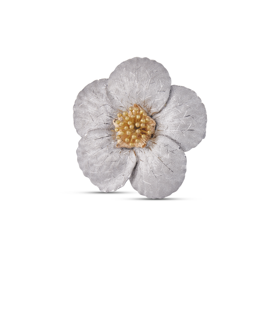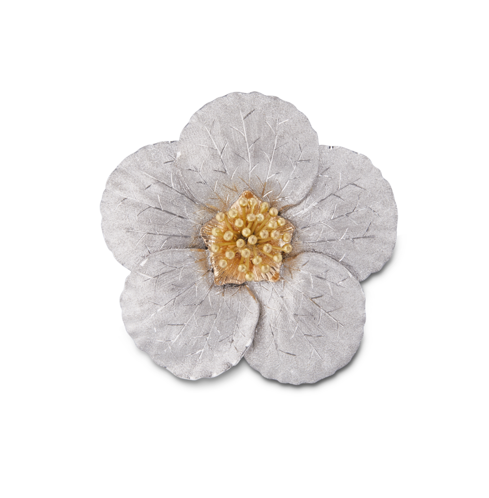 La broche Magnolia, initialement conçue en or jaune, a été introduite dans les collections de Buccellati lors de ses collaborations avec le célèbre grand magasin Wako à Tokyo dans les années 1980. En raison de son succès fulgurant, notamment dans les pays de l’Est, elle a rapidement évolué avec l’ajout d’or blanc et de diamants dans les années 1990. Ces nouvelles versions reflètent la capacité de la Maison à allier tradition et innovation, tout en conservant l’essence de la fleur dans ses créations.
