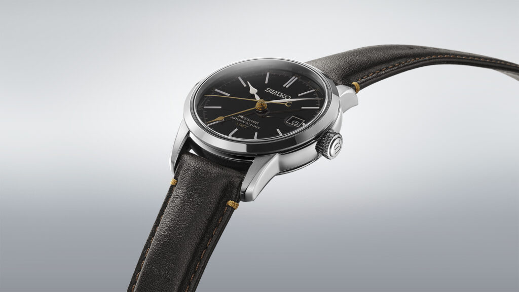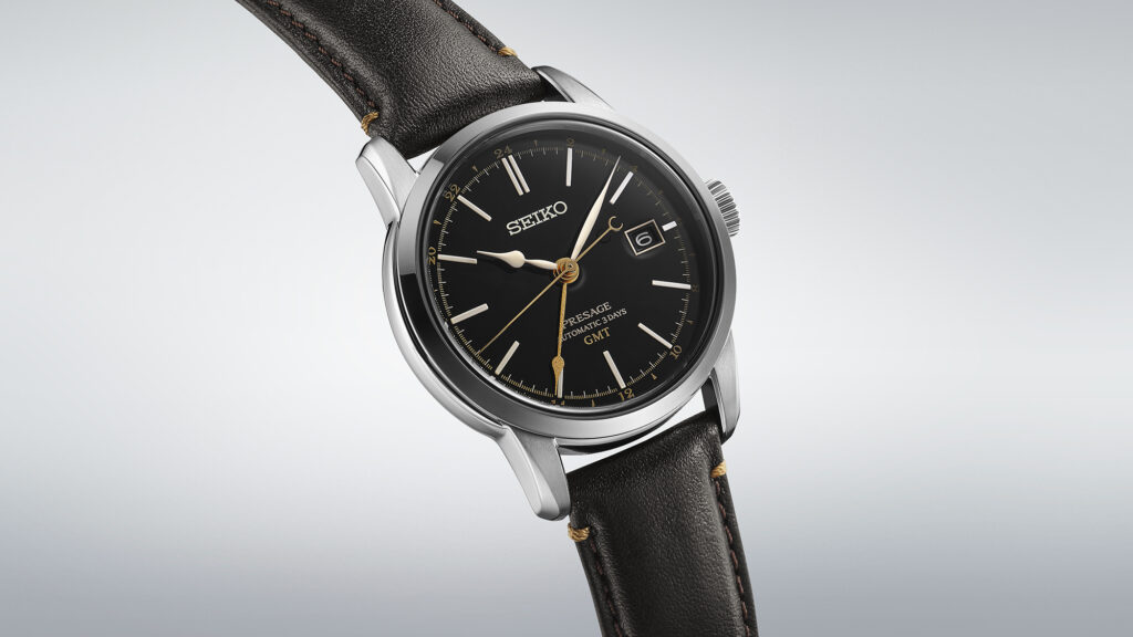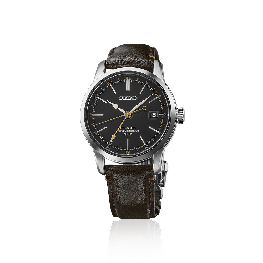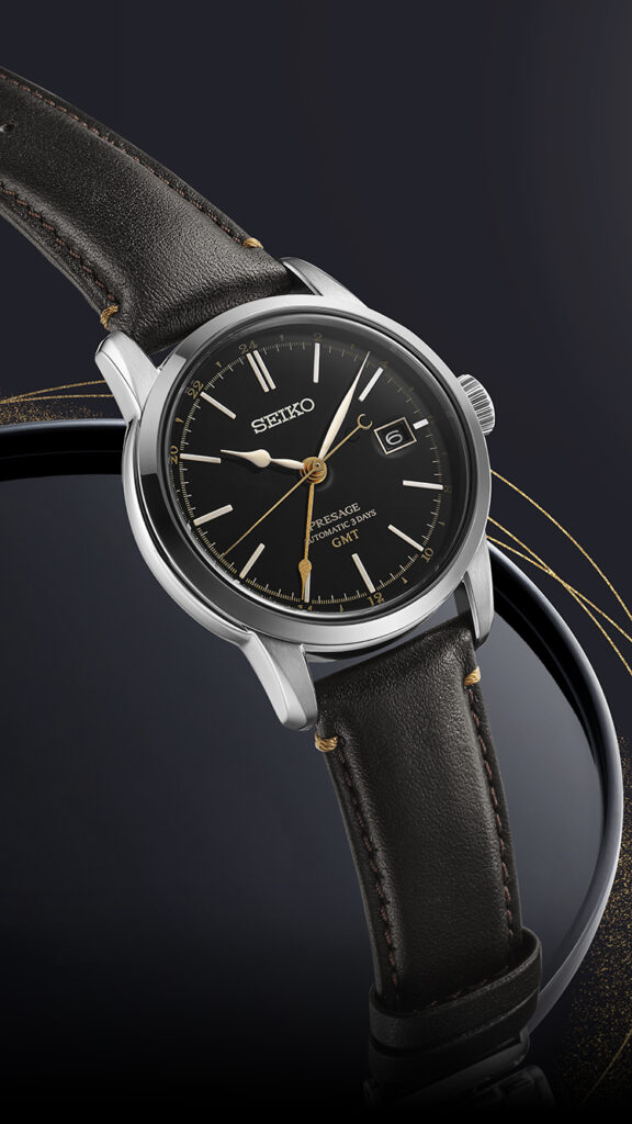 Ce modèle, au design raffiné, associe l’art ancestral de la laque à une esthétique moderne. Le cadran en laque noire brillante est rehaussé d’éléments dorés subtils, notamment l’aiguille GMT et les marqueurs des 24 heures, créant un contraste harmonieux avec les index blancs en relief et les aiguilles polies. La montre se pare d’un boîtier en acier inoxydable avec un verre saphir bombé et un bracelet en cuir issu d’une tannerie certifiée par le Leather Working Group, soulignant l’engagement de Seiko pour une production responsable.