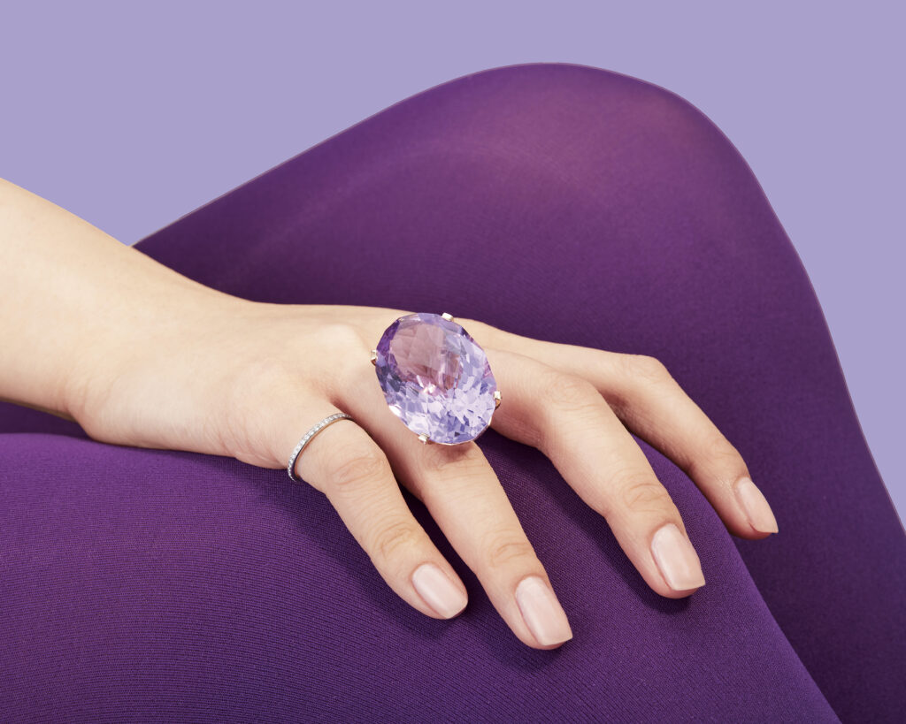 • Bague Double Jeu en or rose avec améthyste taille briolette, montée sur or blanc et sertie de saphirs roses et de diamants. Prix public conseillé : 15 000 €.