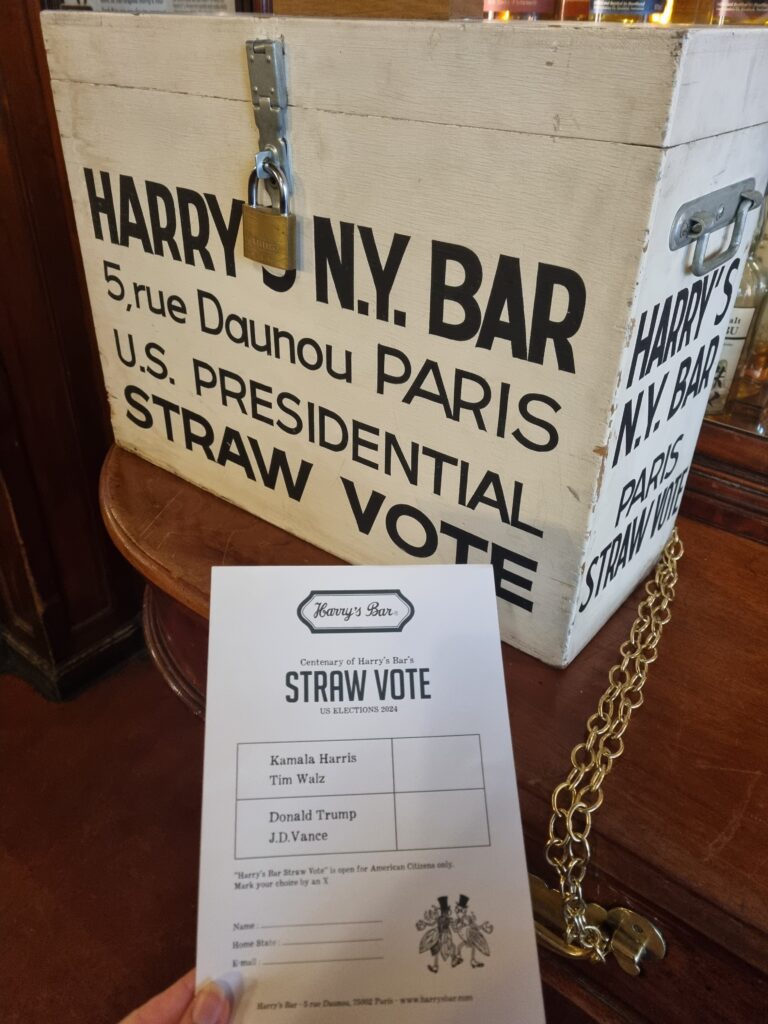 Depuis 1924, le Harry’s Bar organise une élection présidentielle fictive lors des scrutins américains, appelée le « straw vote ». Ce vote de paille permet aux expatriés et touristes américains de voter en présentant leur passeport ou permis de conduire. C’est devenu une véritable tradition et les résultats obtenus sont souvent étonnamment proches de ceux des véritables élections américaines. Ce rituel est une nouvelle démonstration de l’ingéniosité de Harry MacElhone, qui a su marier tradition et innovation dans ce lieu emblématique.