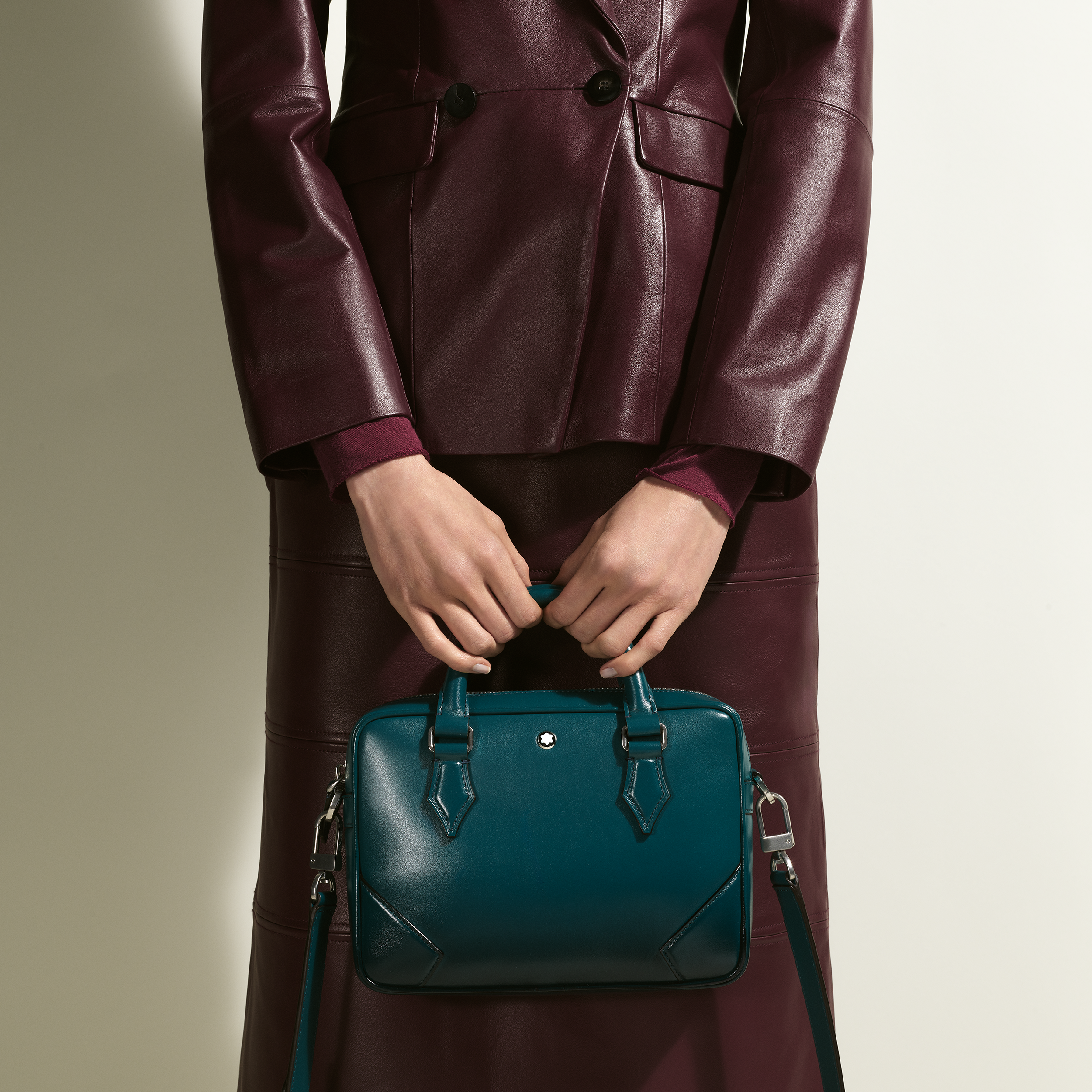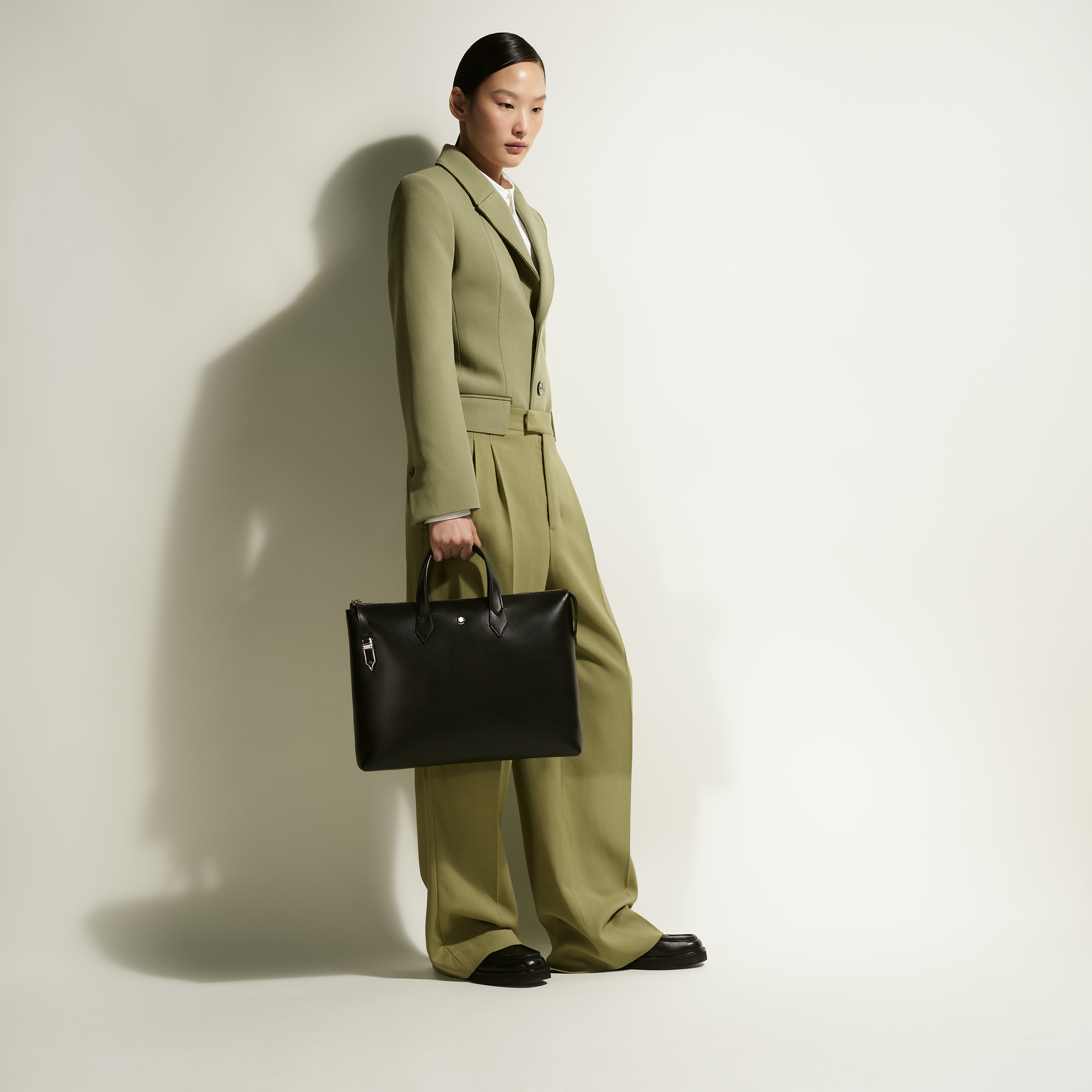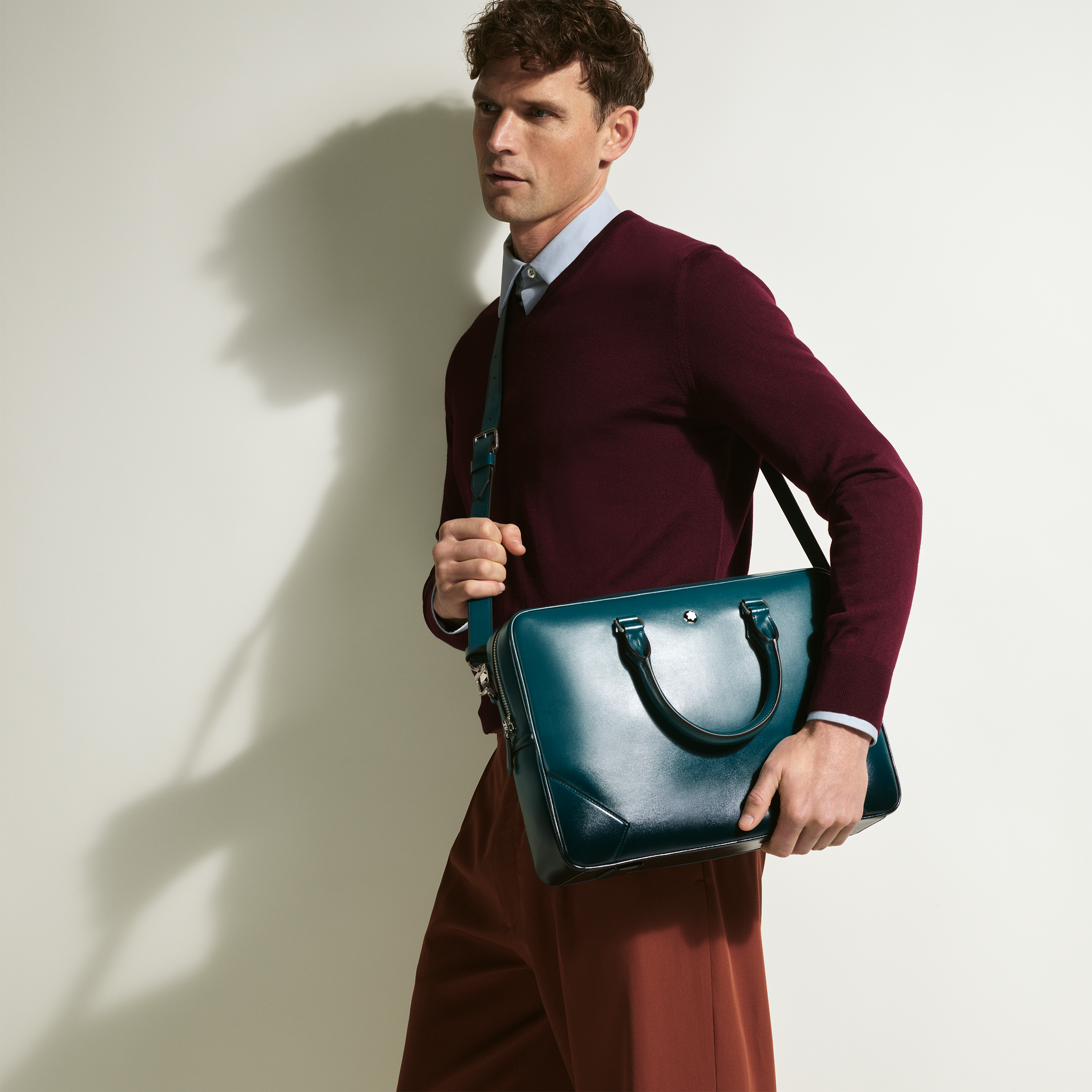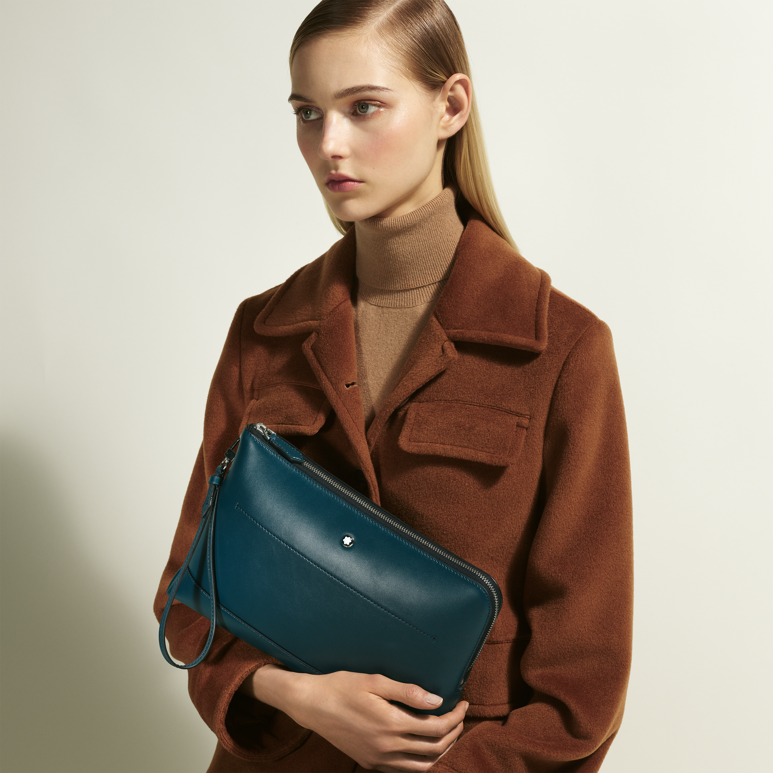 La collection Meisterstück introduit également des versions revisitées de ses modèles les plus populaires, notamment dans les teintes Russet et Cyprus Blue. Le sac Messenger et le porte-documents mini se parent d’un coloris Cyprus Blue sfumato, où des dégradés élégants évoquent l’encre se diffusant doucement sur le papier, un clin d’œil raffiné à l’histoire de l’écriture de Montblanc.