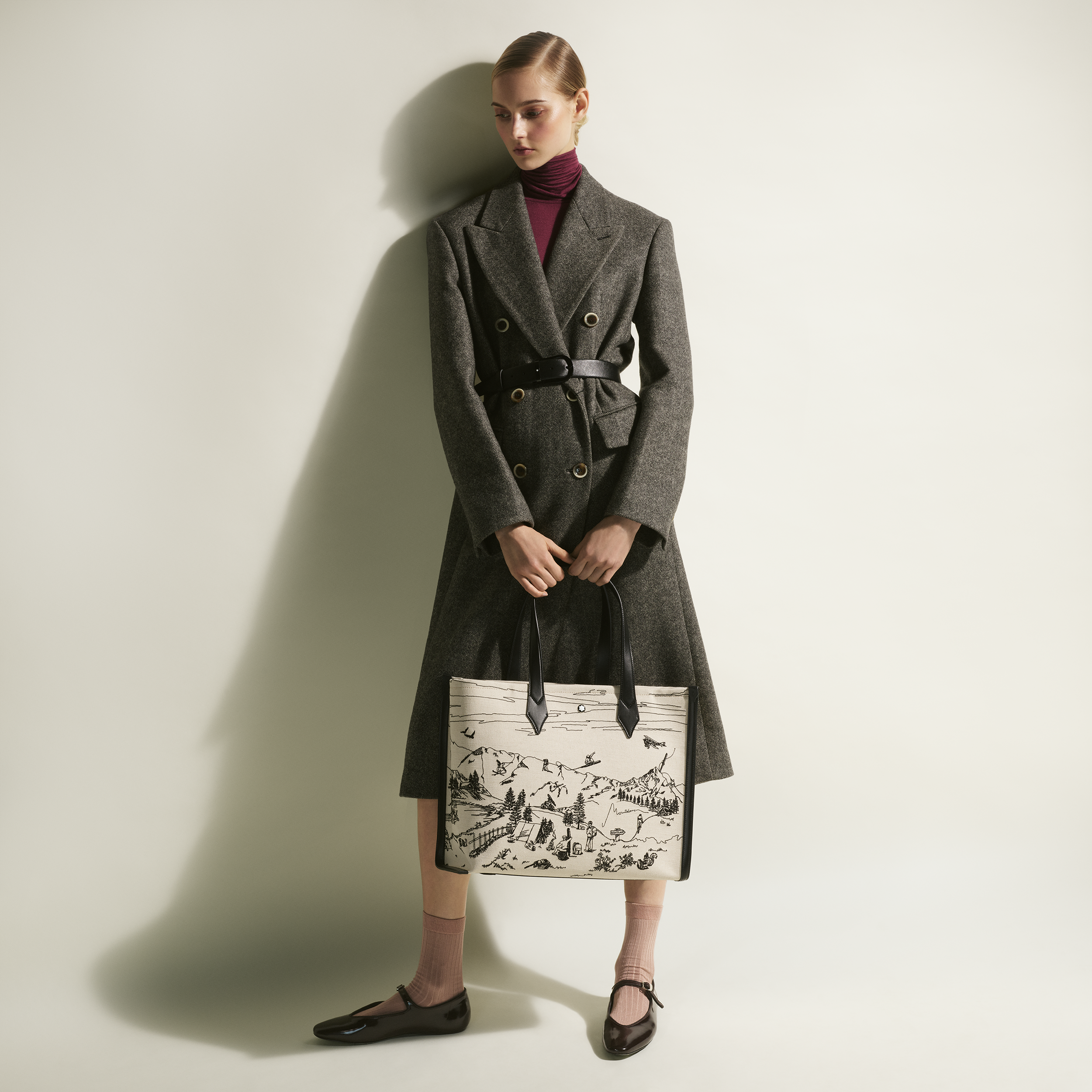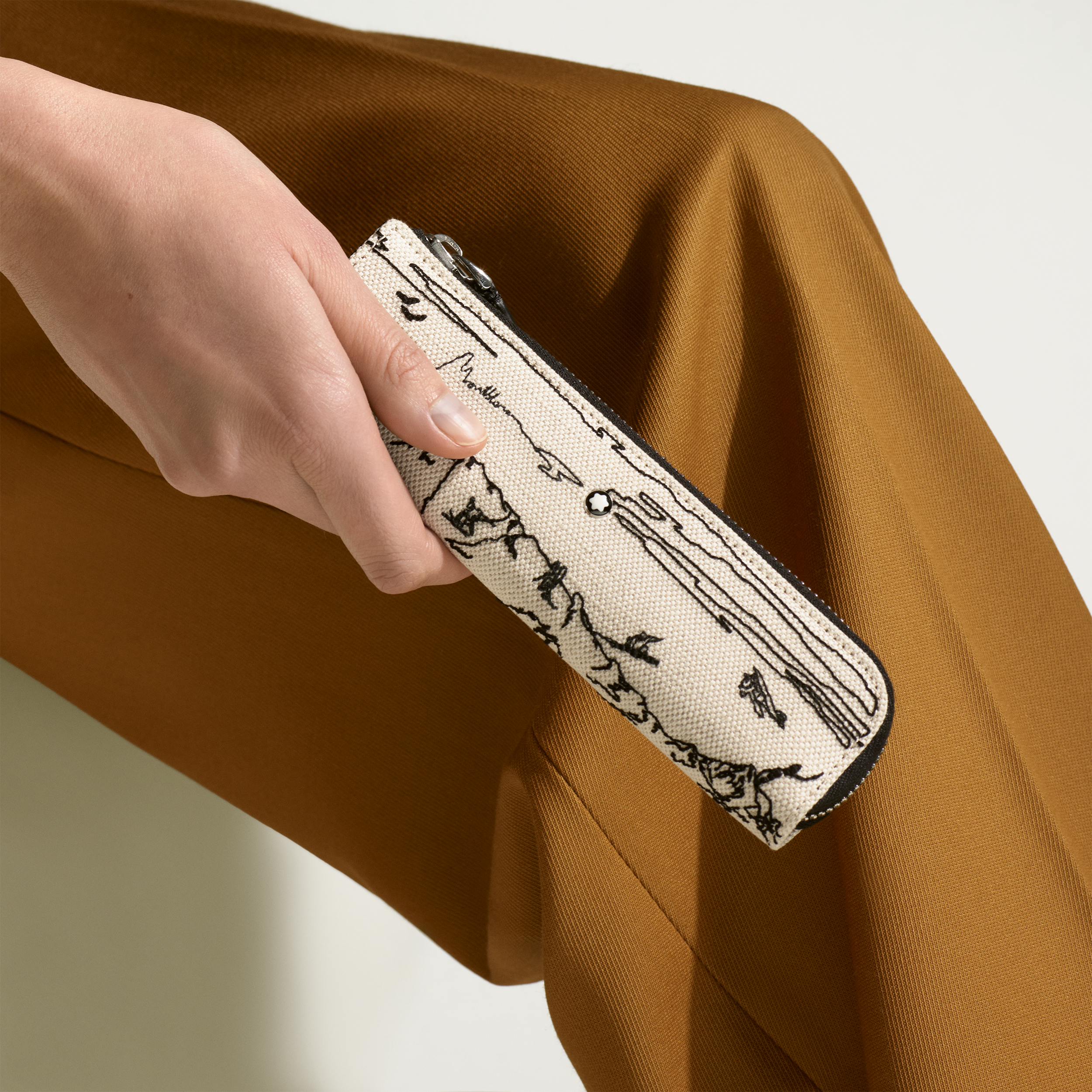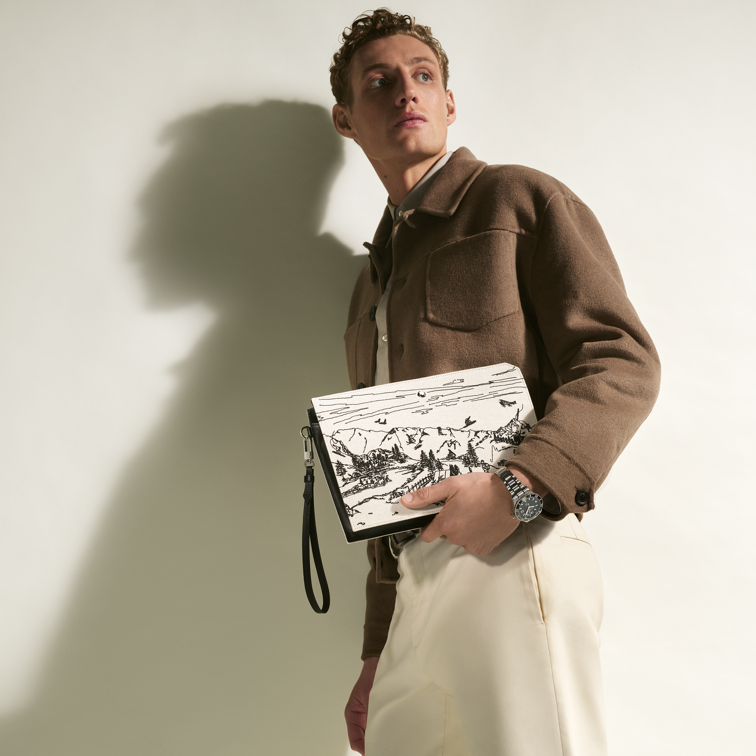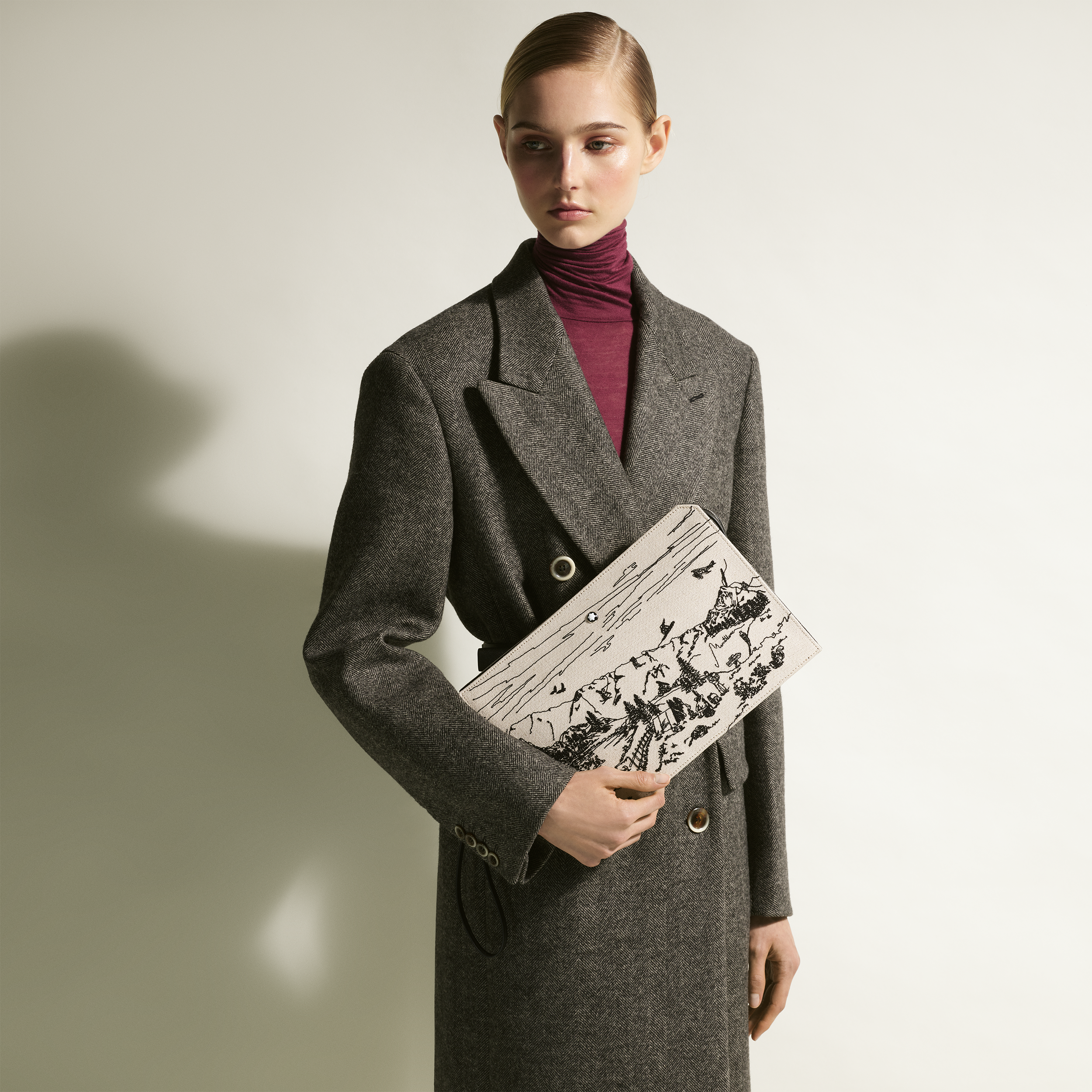 Inspirée par les paysages enneigés des Alpes, la capsule Happy Holidays transporte ses acquéreurs dans un univers hivernal féérique. Arborant des illustrations délicates rappelant des paysages alpins, chaque pièce de la capsule célèbre la beauté de l’hiver avec une broderie noire sur une toile ivoire, à l’image d’encre sur papier. La collection inclut des pièces telles qu’un spacieux cabas, une pochette élégante et un étui à stylo, chaque élément étant orné de détails en cuir inspirés par la forme d’une plume de stylo, réaffirmant ainsi les racines de la Maison dans l’art de l’écriture.