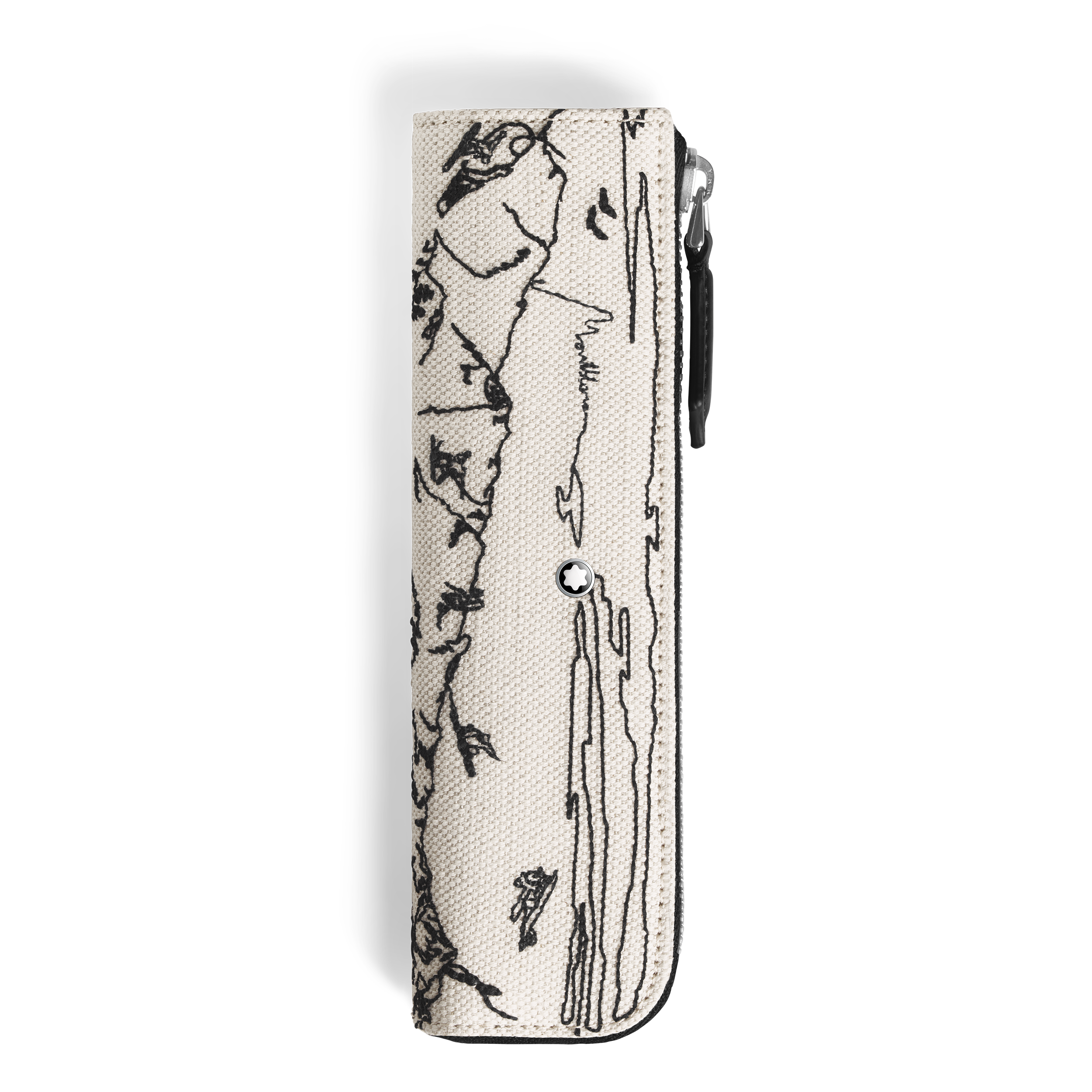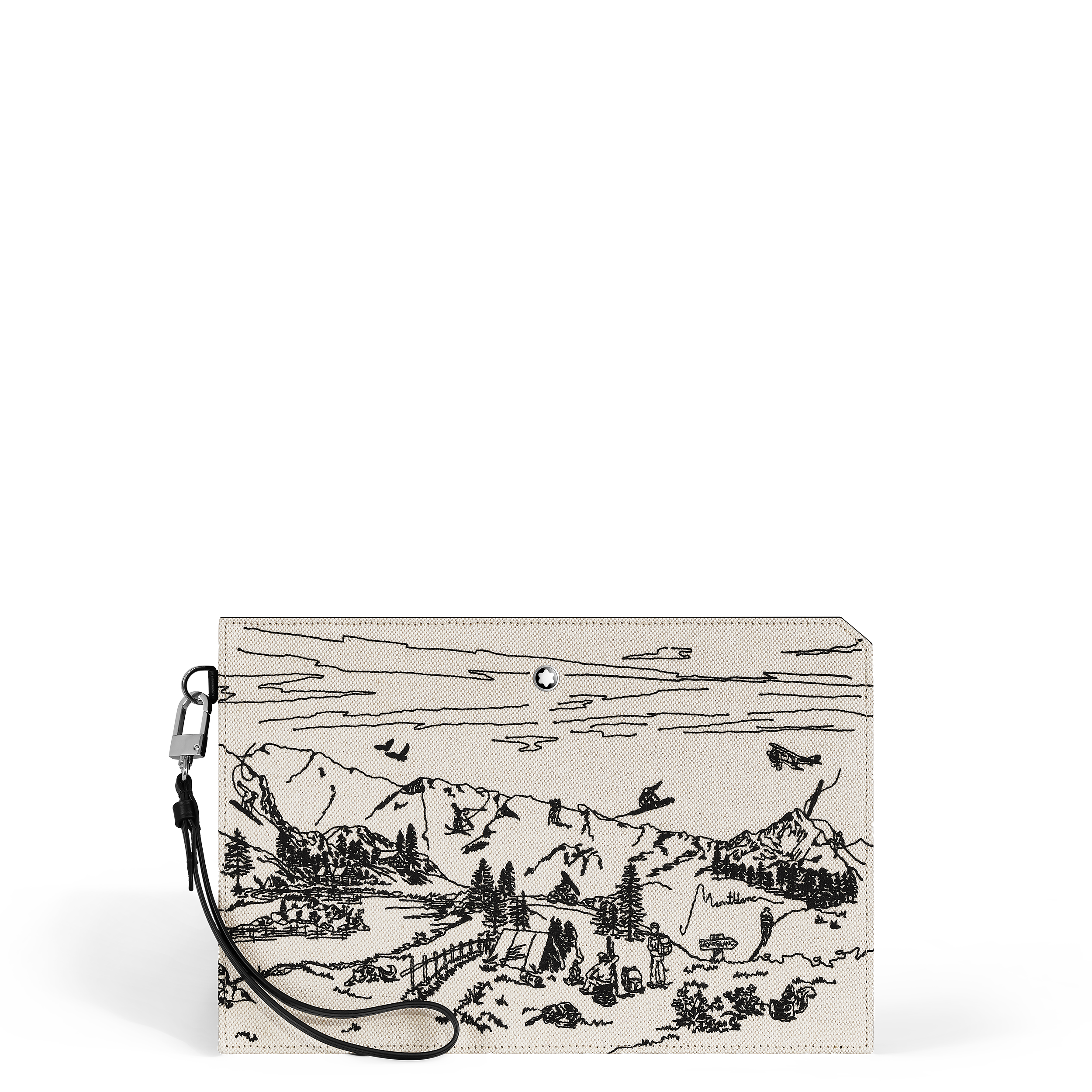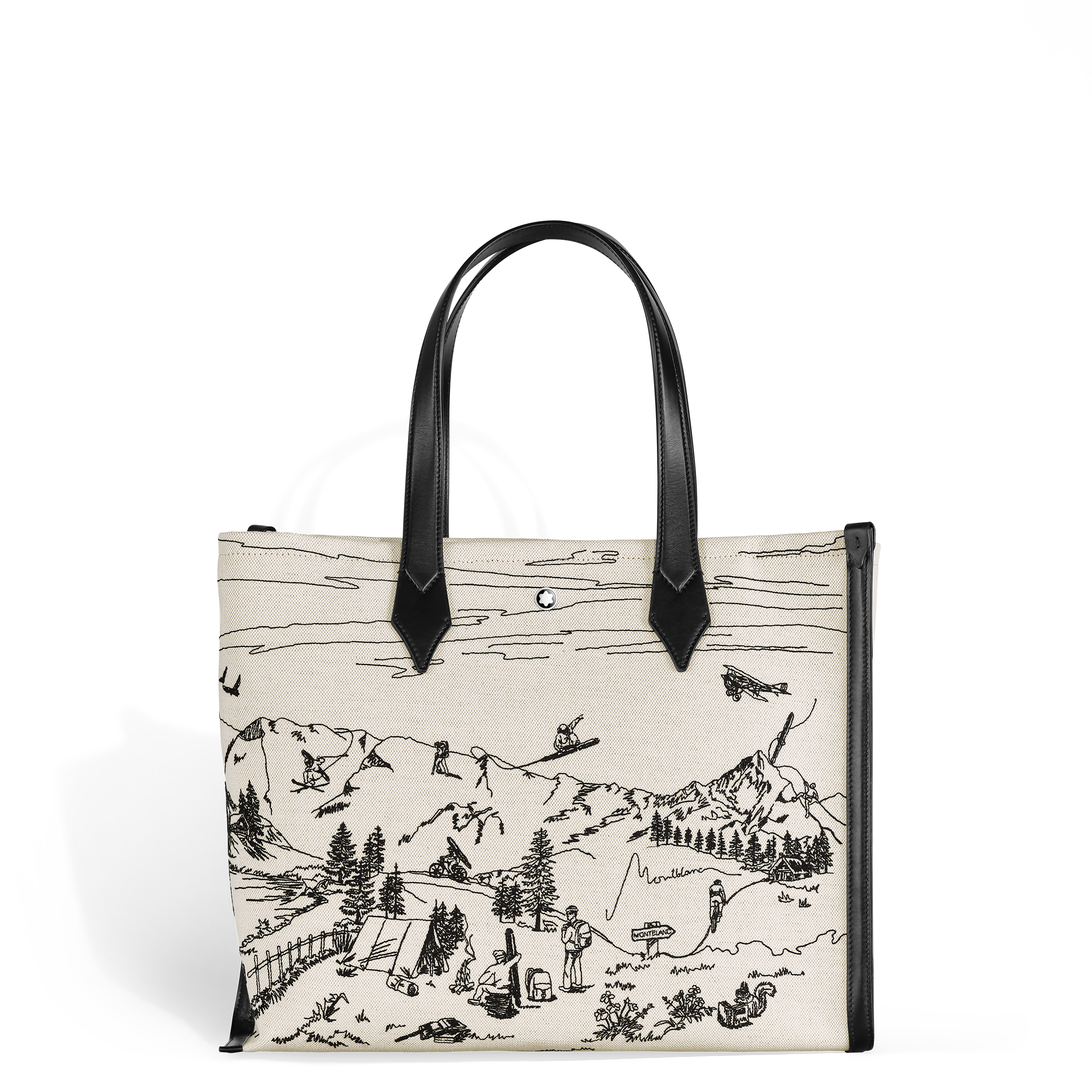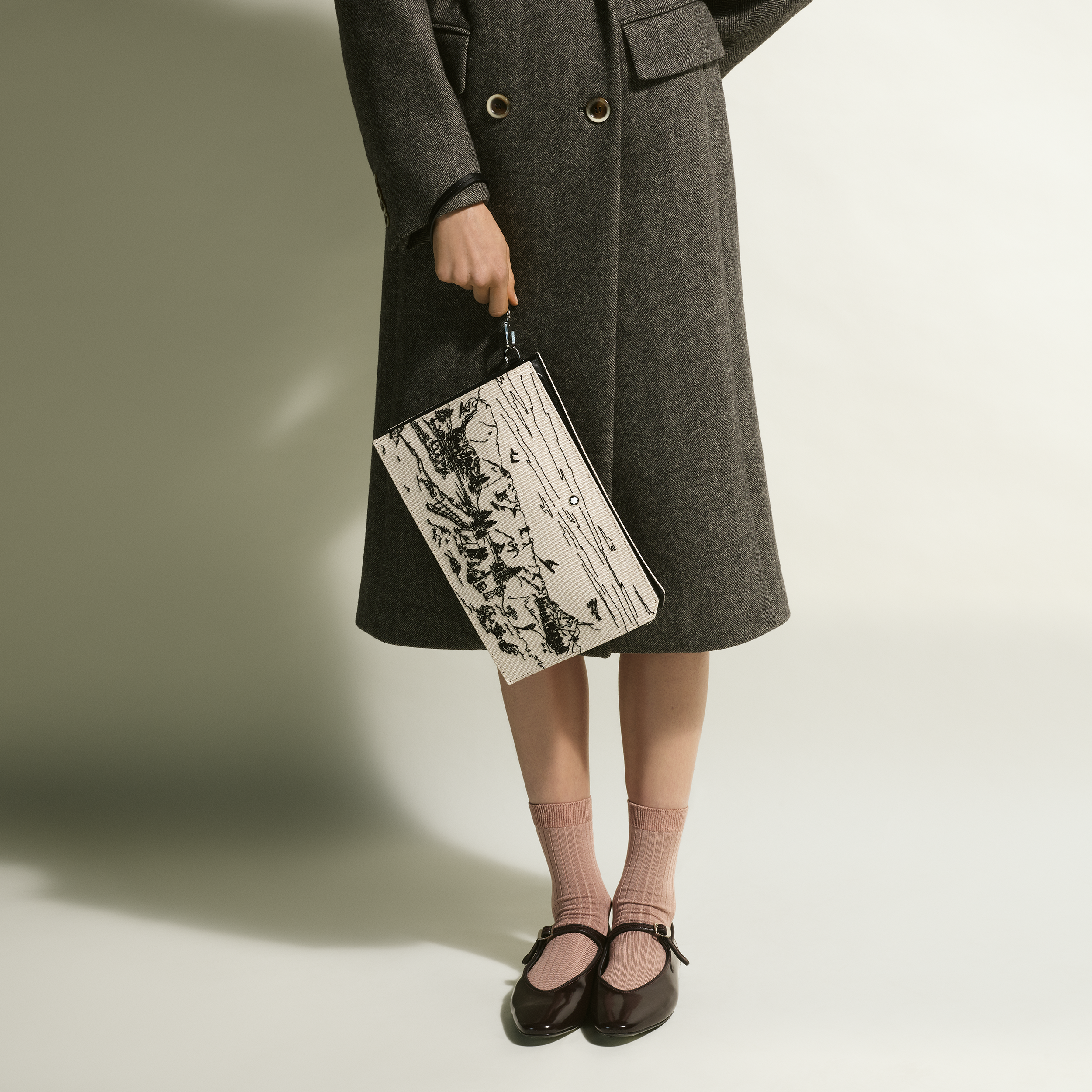 Inspirée par les paysages enneigés des Alpes, la capsule Happy Holidays transporte ses acquéreurs dans un univers hivernal féérique. Arborant des illustrations délicates rappelant des paysages alpins, chaque pièce de la capsule célèbre la beauté de l’hiver avec une broderie noire sur une toile ivoire, à l’image d’encre sur papier. La collection inclut des pièces telles qu’un spacieux cabas, une pochette élégante et un étui à stylo, chaque élément étant orné de détails en cuir inspirés par la forme d’une plume de stylo, réaffirmant ainsi les racines de la Maison dans l’art de l’écriture.