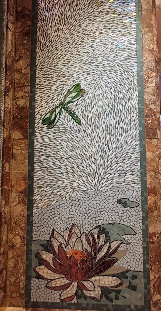 Chaque détail semblait raconter une histoire, des miroirs aux motifs ruisselants rappelant des gouttes de pluie, jusqu’aux panneaux de verre gravés représentant des nymphes, sculptés à la main par le maître verrier Éric Bonte.