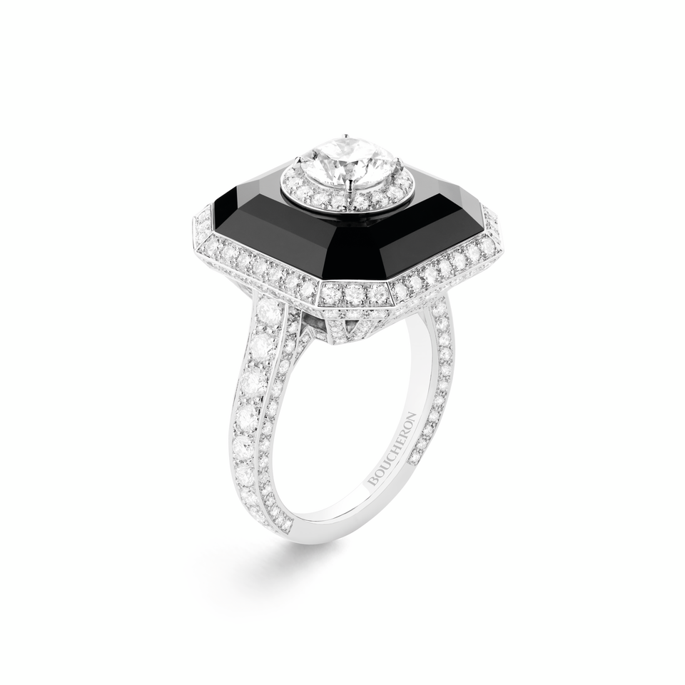 - Bague Pierre Graphique : Ce chef-d’œuvre moderne mêle un diamant de 2,19 carats, des pavages délicats et un onyx noir audacieux sur une monture en or blanc.