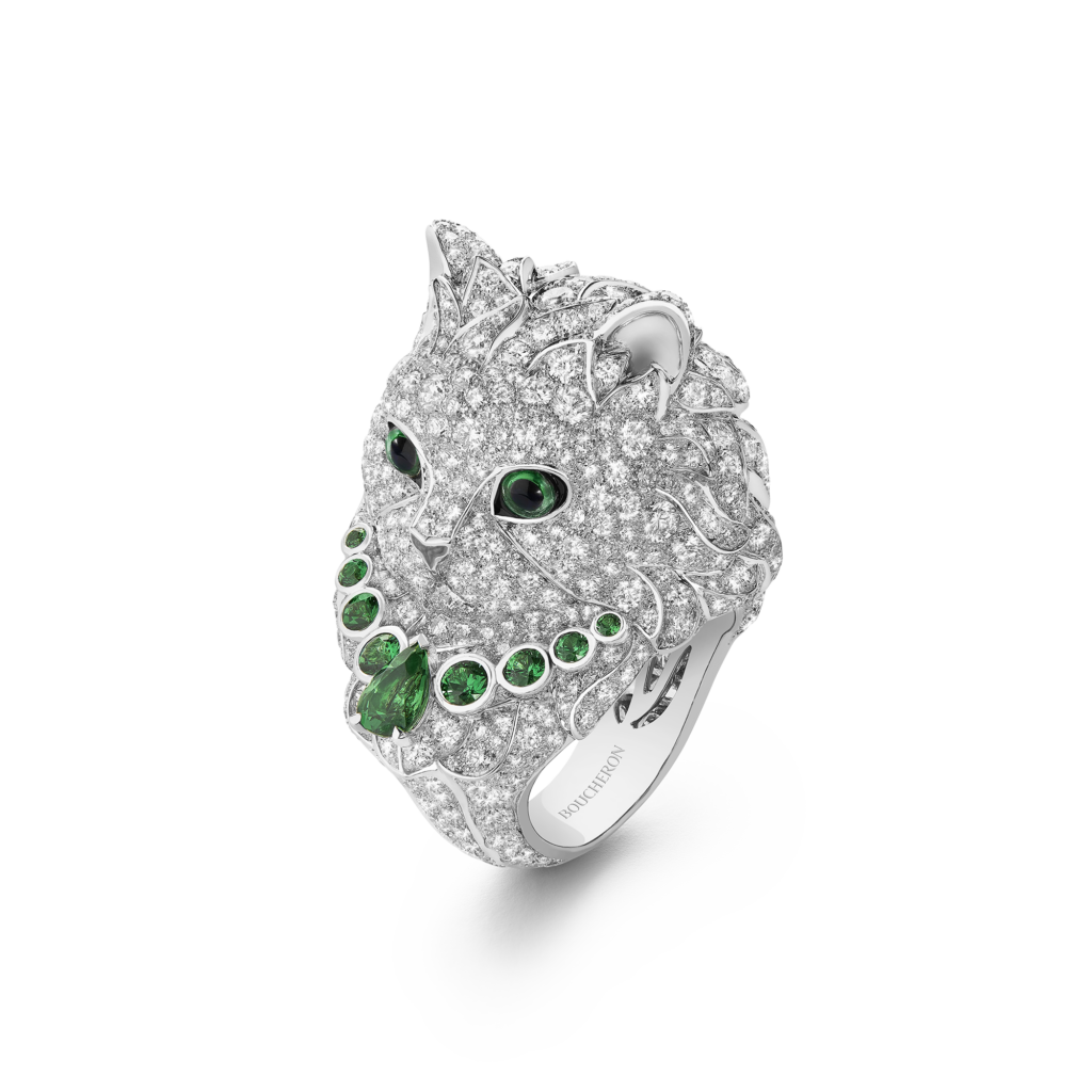 - Bague Wladimir, le Chat : Une pièce exubérante et pleine de caractère, pavée de diamants et ornée de tsavorites, nacres et saphirs, qui célèbre le célèbre chat Wladimir, symbole maison.