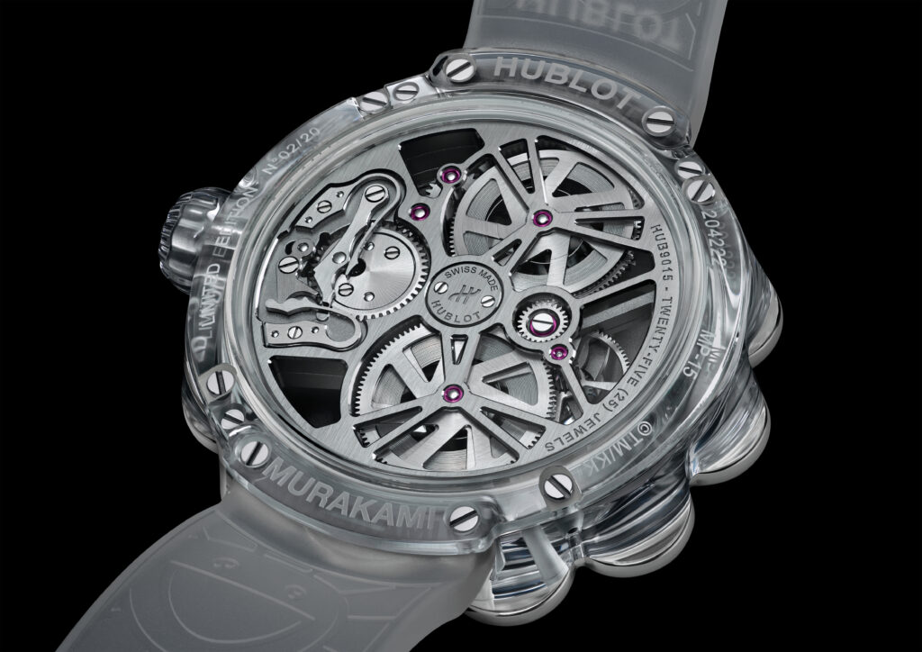 Sous cette apparence exubérante se cache une mécanique horlogère complexe. La montre est animée par un tourbillon manuel HUB9015, un mouvement haute précision composé de 236 composants et de 25 rubis, avec une réserve de marche d’environ 120 heures. La MP-15 dispose également d’un boîtier en saphir poli et titane, offrant une résistance à l’eau jusqu’à 30 mètres. Ce garde-temps de 42 mm de diamètre et d’une épaisseur de 13,4 mm est un véritable bijou de technicité et de design.
