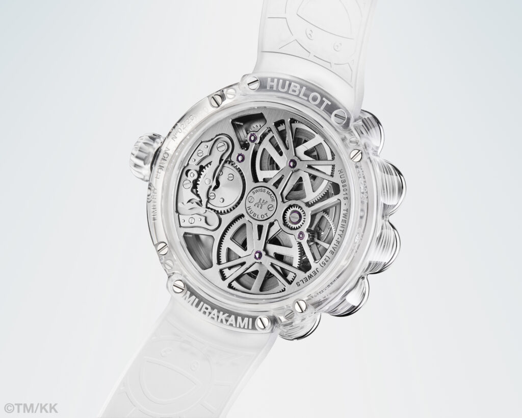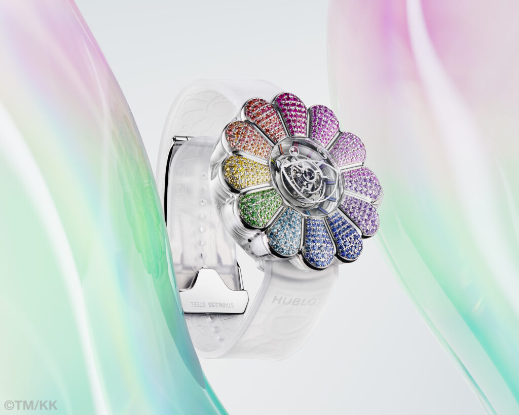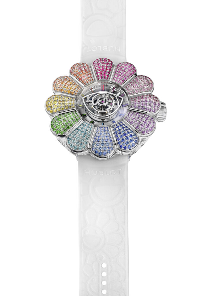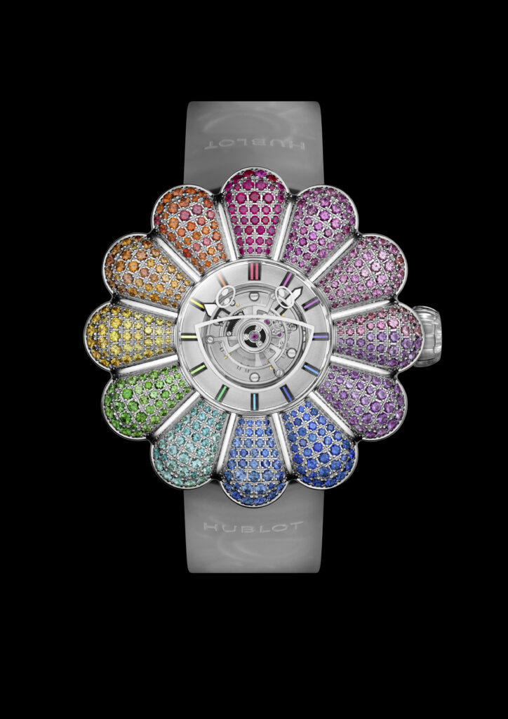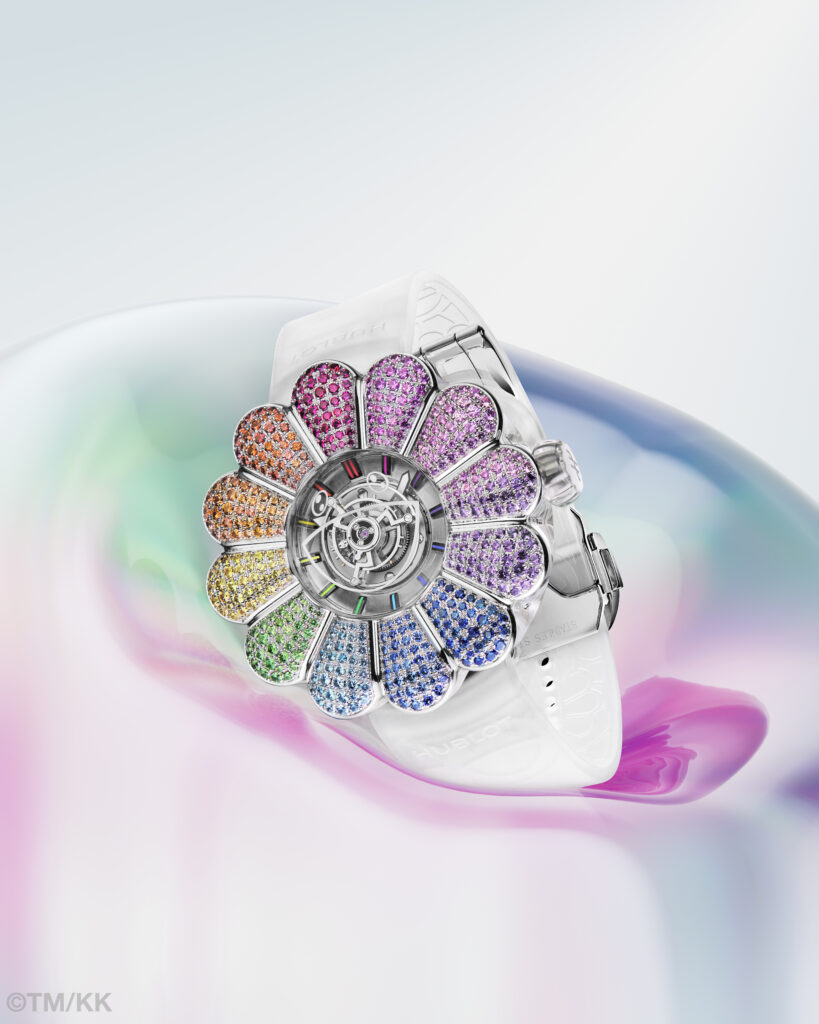Inspirée de l’univers coloré et espiègle de Takashi Murakami, la MP-15 Tourbillon Sapphire Rainbow brille par son cadran et sa lunette sertis de 444 pierres précieuses multicolores. Rubis, saphirs roses, améthystes, saphirs bleus, topazes bleus, tsavorites, et saphirs jaunes ou orange se rencontrent pour créer un arc-en-ciel lumineux autour de la montre. Ce jeu de couleurs vives et envoûtantes est une signature visuelle forte de Murakami, qui transpose son art pop japonais dans l’univers du luxe.
