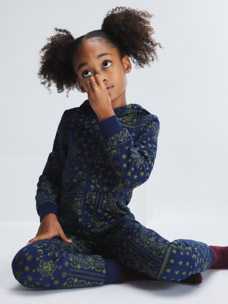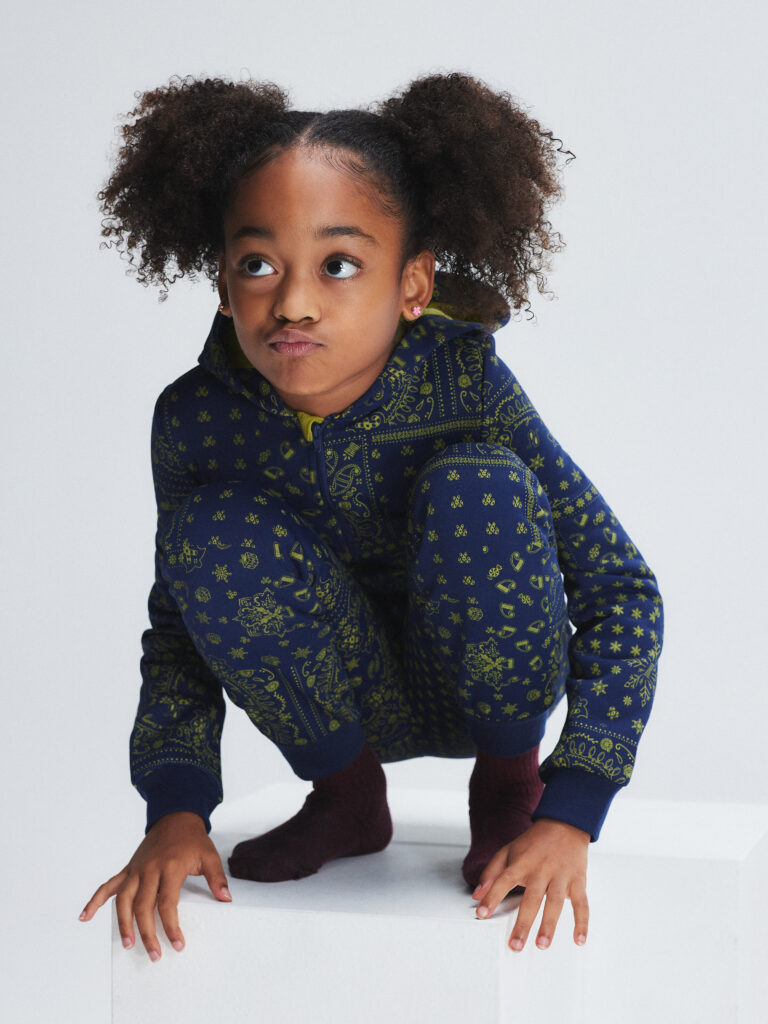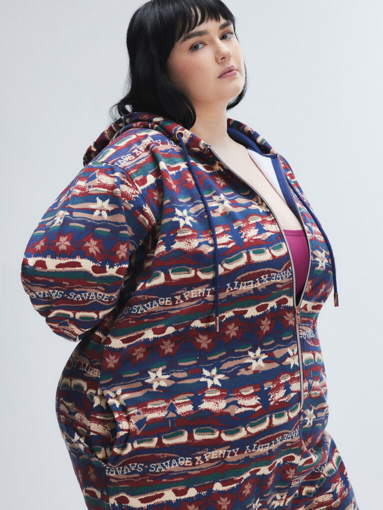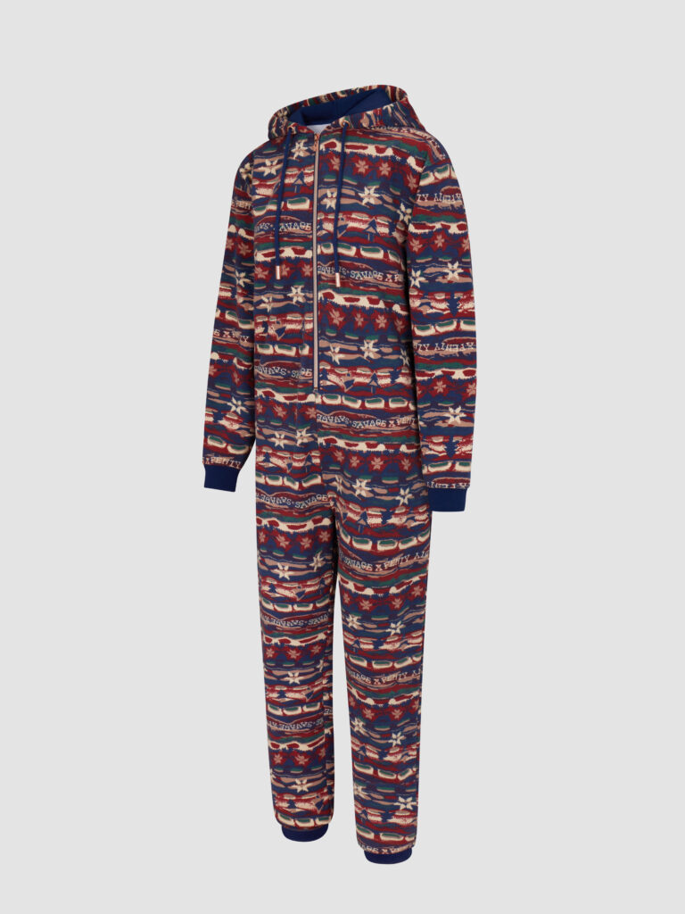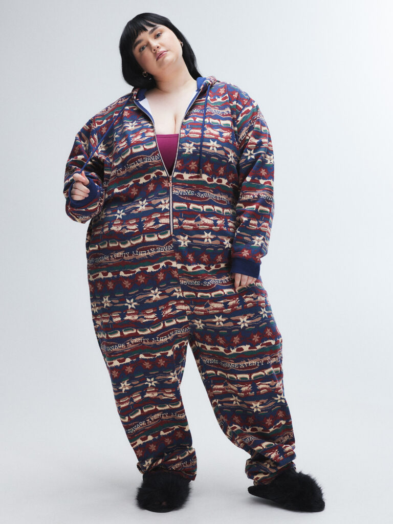 Pour la première fois, Savage X Fenty lance une collection de onesies familiaux Forever Savage, disponibles dans des imprimés festifs inspirés des fêtes. Les tailles incluent des options pour les parents, les enfants, les bébés et les tout-petits. Rihanna elle-même a été photographiée portant le Forever Savage Hooded Onesie en imprimé Navy Blue/Sage Day Green Holly Daze, avec RZA et Riot dans les versions pour enfants et bébés.