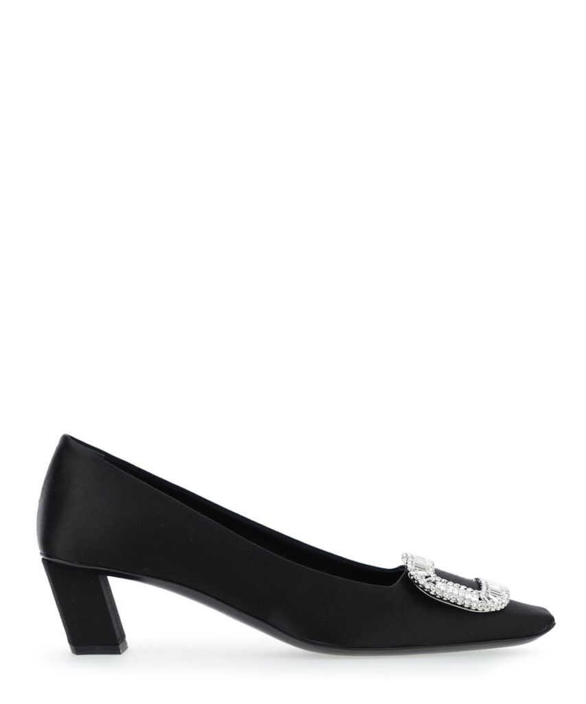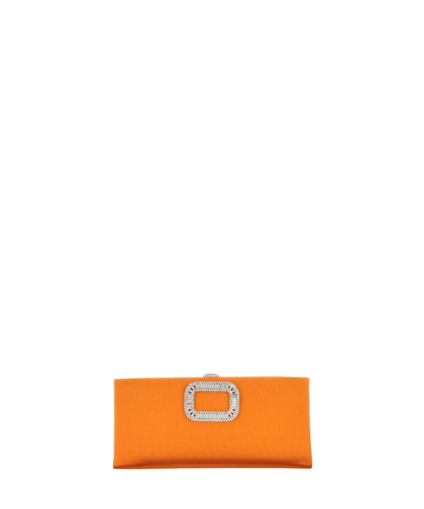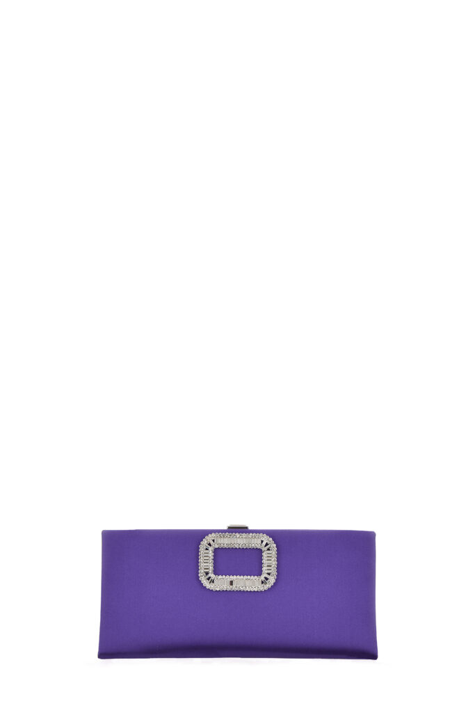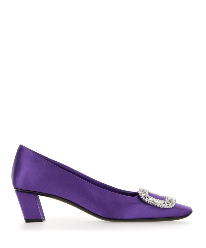 - Belle Vivier pump en satin orange ou violet, ornée de la boucle Pilgrim sertie de cristaux baguette.