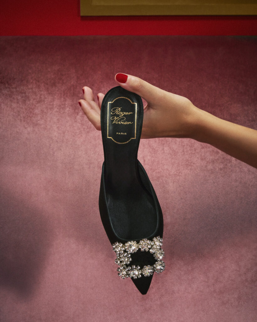 - Une nouvelle mule ornée de la boucle florale en cristaux, rehaussant l’élégance des soirées hivernales.