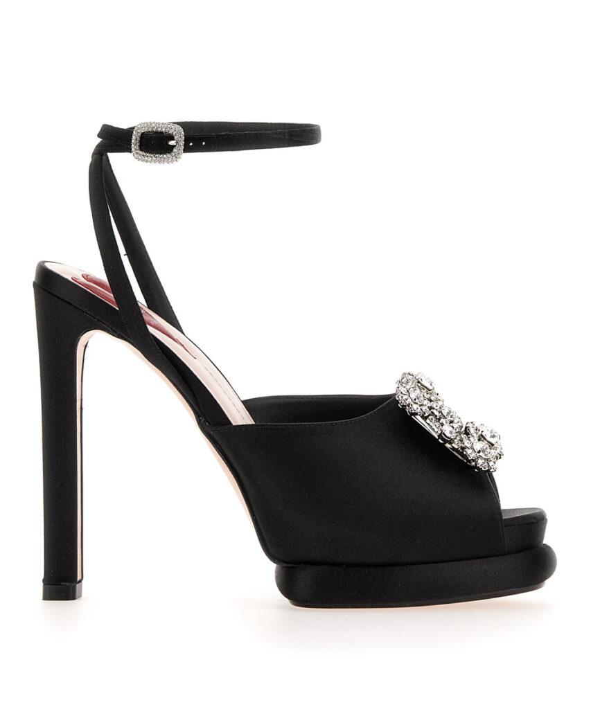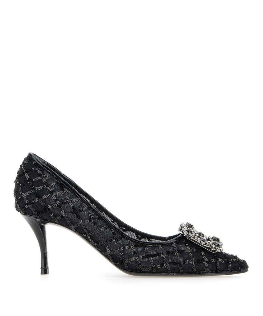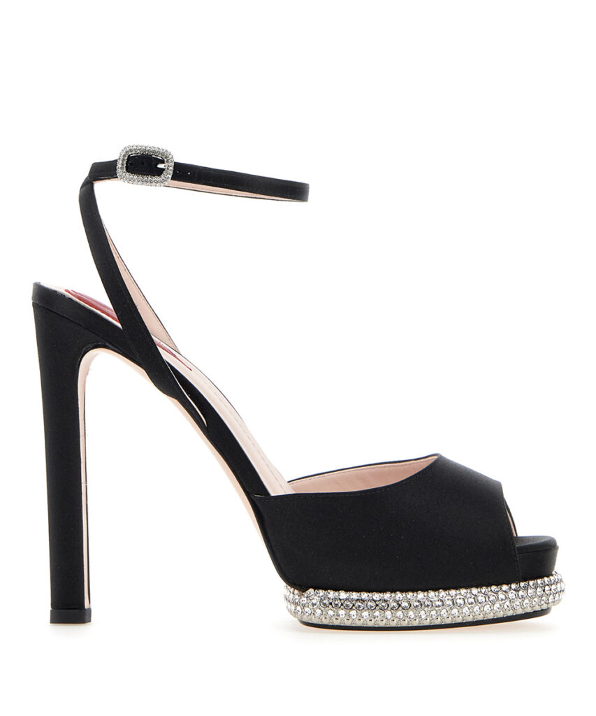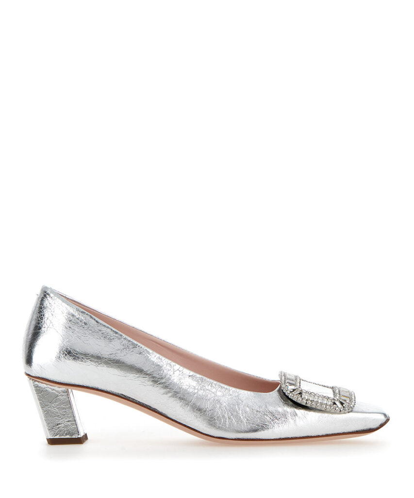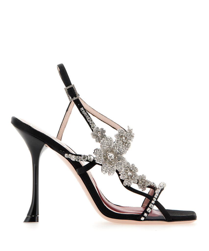 - Une version slingback argentée, enrichie d’éléments miroirs, perles et strass.