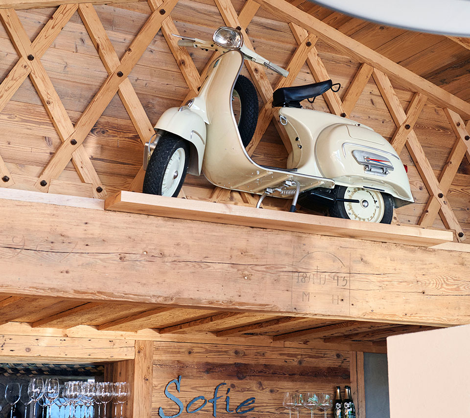 À l’intérieur de Baita Sofie, une Vespa historique rend hommage au riche passé de la marque, tandis qu’à l’extérieur, une Vespa 946, symbole d’innovation, accueille les visiteurs. Ce contraste entre tradition et modernité reflète parfaitement l’esprit Vespa.
