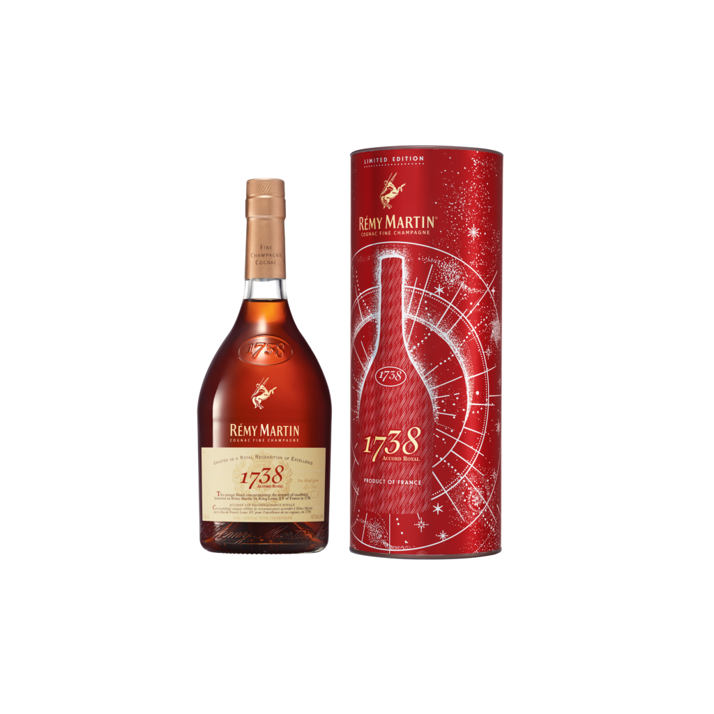 Pour le Cognac 1738 Accord Royal, la Maison dévoile un coffret cylindrique célébrant l’exceptionnelle reconnaissance accordée par le roi Louis XV en 1738. Décorée de motifs astraux en rouge, or et argent, cette édition limitée reflète l’alliance entre douceur boisée et richesse aromatique, caractéristique de ce Cognac vieilli en fûts toastés.