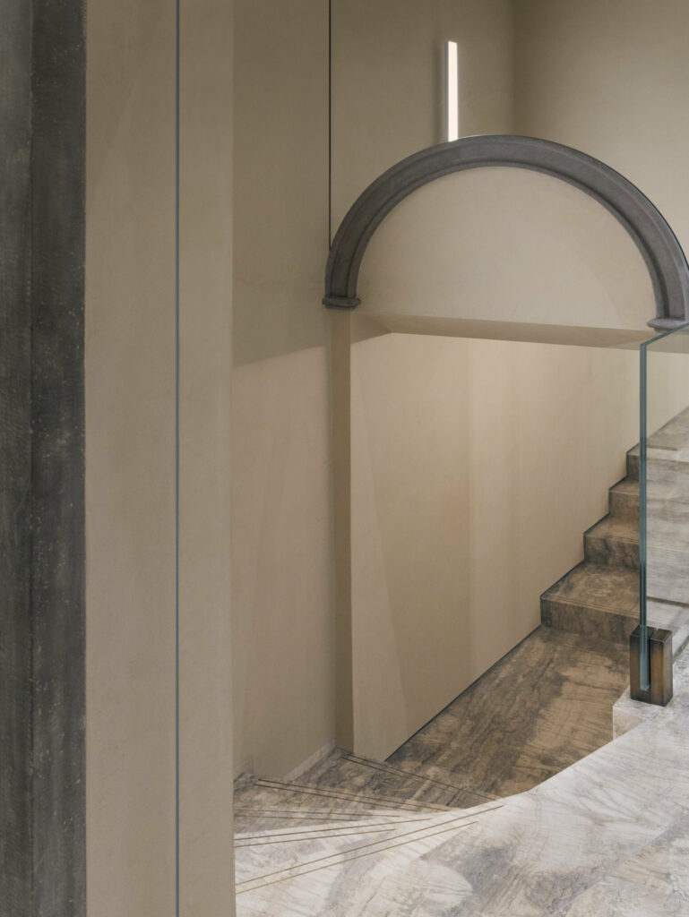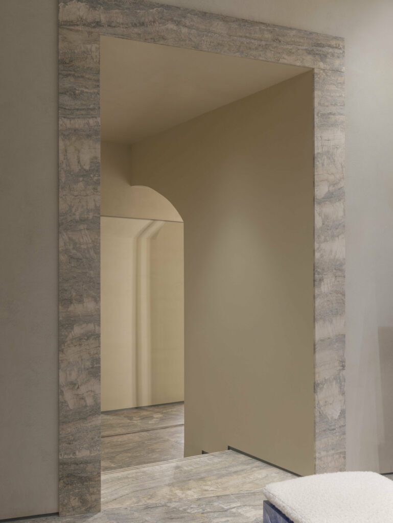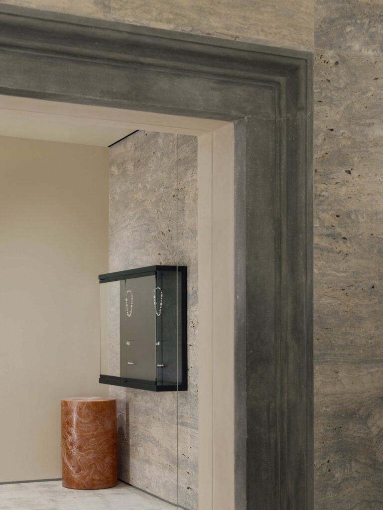 Le nouvel espace conserve et magnifie les éléments historiques du bâtiment avec un design épuré et contemporain. Dès l’entrée, taillée dans la pierre, le visiteur est accueilli par des surfaces minérales évoquant la puissance brute des éléments naturels. Les murs et sols, revêtus de travertin bleu-argenté, déploient une ambiance minérale, intemporelle. Basé sur un concept initialement conçu par CMK pour le flagship londonien de la marque, ce design poursuit l’engagement des Meier envers des matériaux naturels et recyclés, pensés pour s’embellir avec le temps.