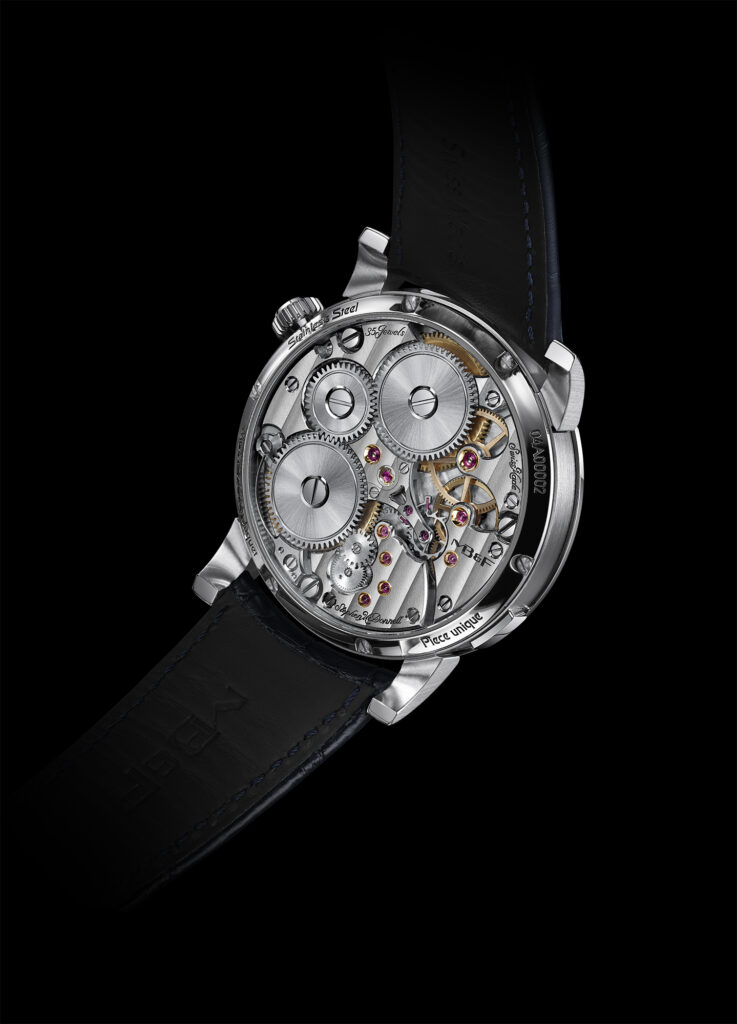 La Legacy Machine Split Escapement (LM SE) se distingue par son échappement dissocié, où la roue de balancier flotte au-dessus du cadran, tandis que l’ancre et la roue d’échappement sont situées sous le mouvement. Développée par Stephen McDonnell, cette mécanique sophistiquée offre une réserve de marche de 72 heures et des finitions soignées dans le style du XIXe siècle, avec des côtes de Genève et des angles polis. Le boîtier en acier inoxydable de 44,5 mm, étanche jusqu’à 30 mètres, accueille un mouvement de 296 composants, complétant l’œuvre d’art de chaque cadran.